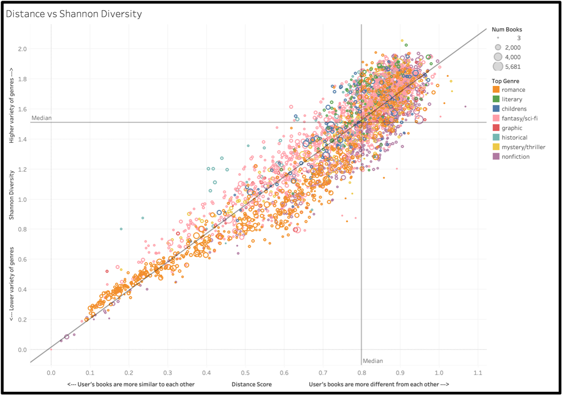 Figure 2 is a plot of our users by Distance Score (on the x axis) and Shannon Score (on the y axis). The sloping fit line tells us that the two figures are quite closely correlated. (In a linear regression, r2 = .87 and p < .0001.) That makes sense, since we used the same genre/shelf information to calculate them. Nevertheless, the two metrics still create meaningful space between our readers, and from this plot, a few generalizations can be drawn about the most and least eclectic users in our study. In the southwest quadrant, at the very low end of both the Shannon and Distance scales, we find a preponderance of readers (colored orange) whose most favored genre is romance (Figure 3). At the opposite, northeast corner of the scales, we see comparatively few romance readers, and a high fraction of the readers who favor literary fiction (green). Overall, as presented in Table 2, romance readers collectively have the lowest Distance Scores and the lowest Shannon Scores, while readers who favor literary fiction score the highest on Shannon and the second highest on Distance, just slightly behind readers of mystery/thriller.