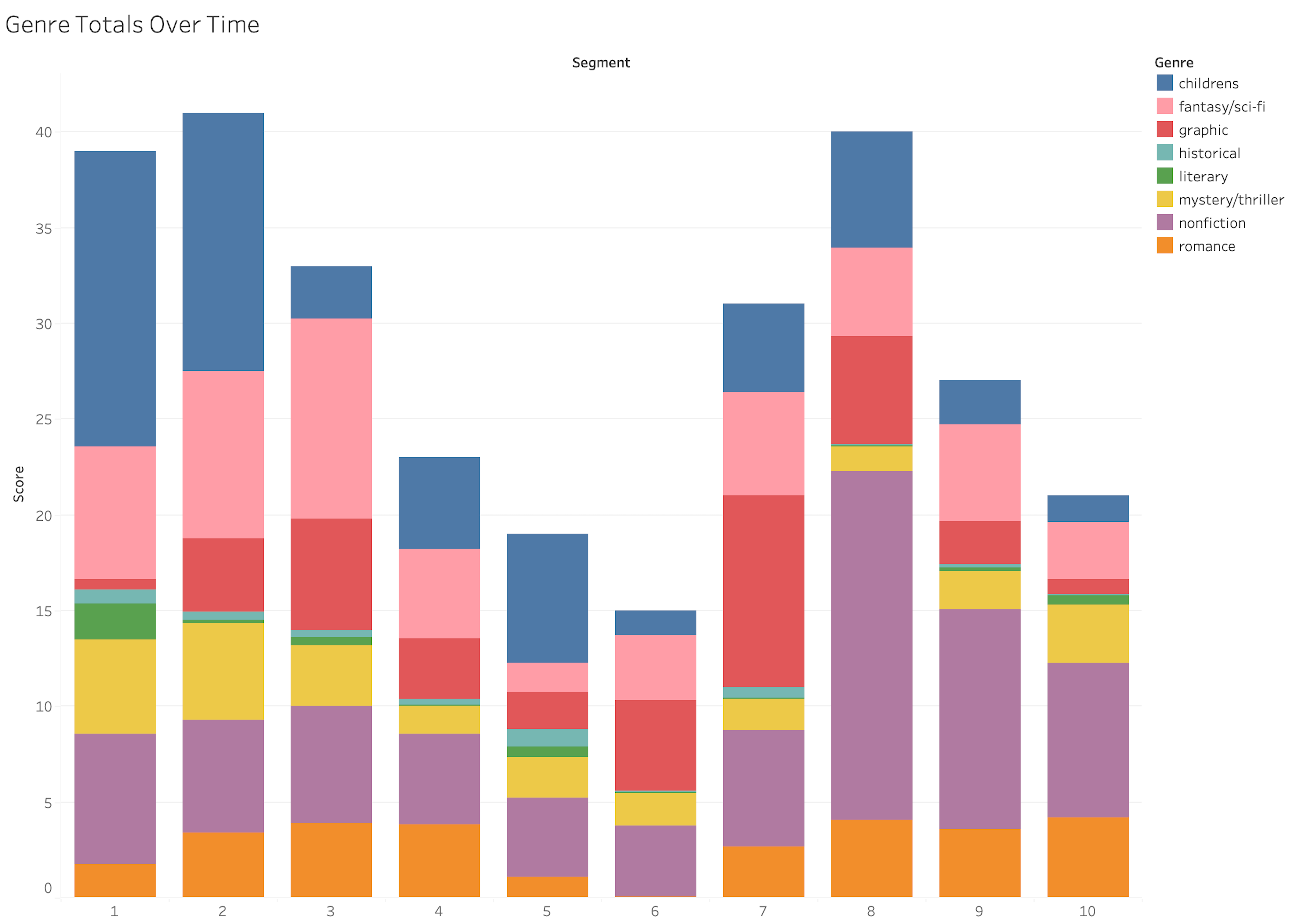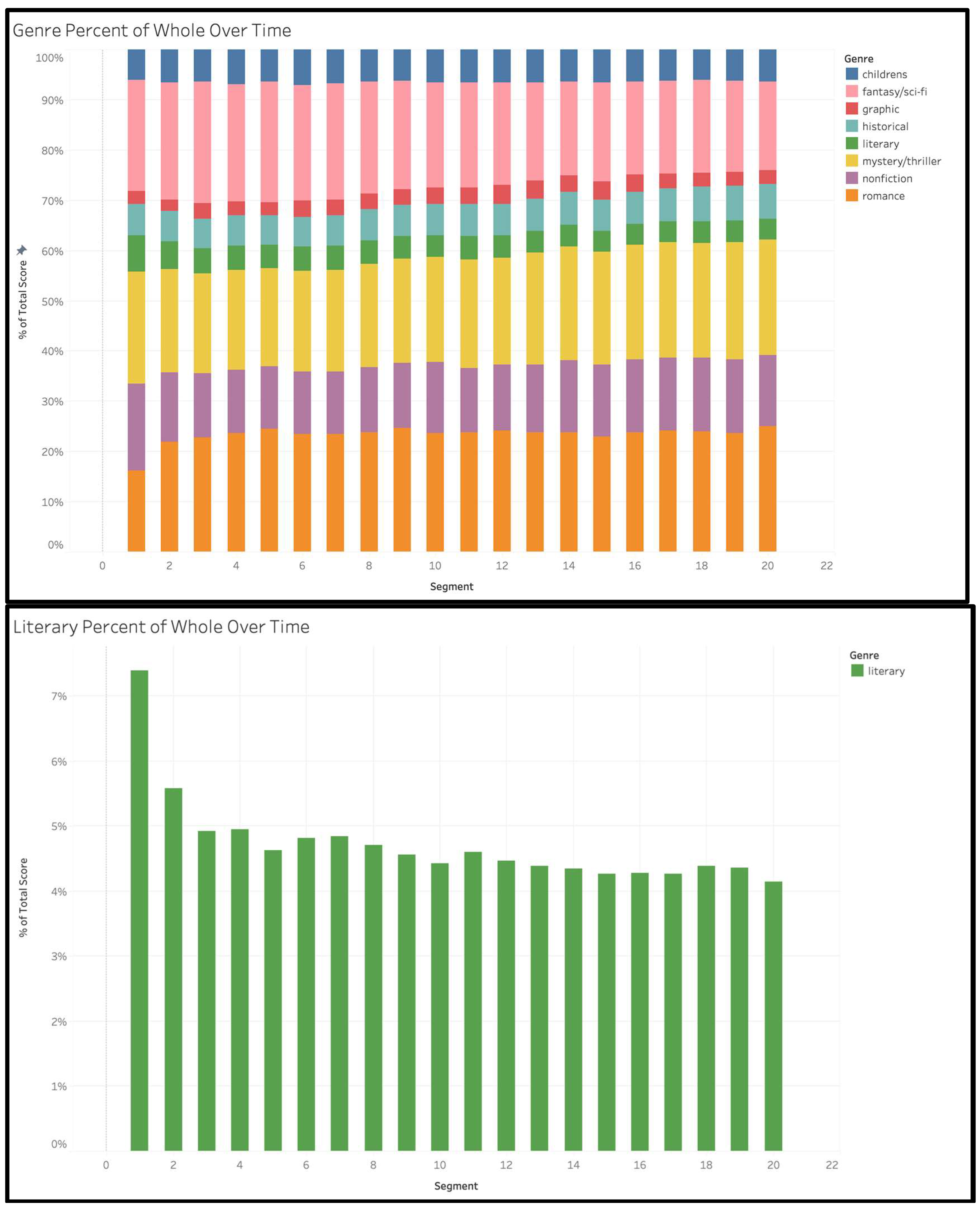 The upper image of Figure 4 shows the time-segmented data aggregated for all users as a stacked bar chart. As we see in the lower image, works of literary fiction (green), comprise 7.4% of the books in segment 1, which is sixty percent higher than the mean value of 4.6% in the remaining segments. Readers add more literary fiction to their collections in that first segment than they do historical fiction (teal) or children’s fiction (dark blue), genres that represent a larger share than literary fiction for every other segment. Conversely, readers allocate proportionally fewer titles to romance in the first segment (about 16%) than they do later on (averaging about 24%). What seems to be happening is that when someone first creates an account on Goodreads, they populate the shelves of their collection with a set of books they’ve already read. And those books typically include the classic novels they read in school: To Kill a Mockingbird, The Great Gatsby, A Tale of Two Cities. Some of our users were still in school or college when they opened their Goodreads accounts, and may have been adding these books in real time rather than retroactively. But the result is the same: literary fiction appears at first to represent a significant slice of their reading, and it provides a boost to their overall eclecticism numbers, even if it has no obvious place in their subsequent taste profile. We can see this pattern clearly expressed in the time-segmented shelf totals of a user visualized in Figure 5. Active on Goodreads since 2012, this reader began her collection with The Catcher in the Rye, The Great Gatsby, and Jane Eyre. More than half the books she added in the early months are classified as literary fiction, while romance comprised just 2% and nonfiction about 4%. These ratios are the opposite of her reading over the subsequent decade, which was 90% romance or nonfiction and less than 2% literary fiction.