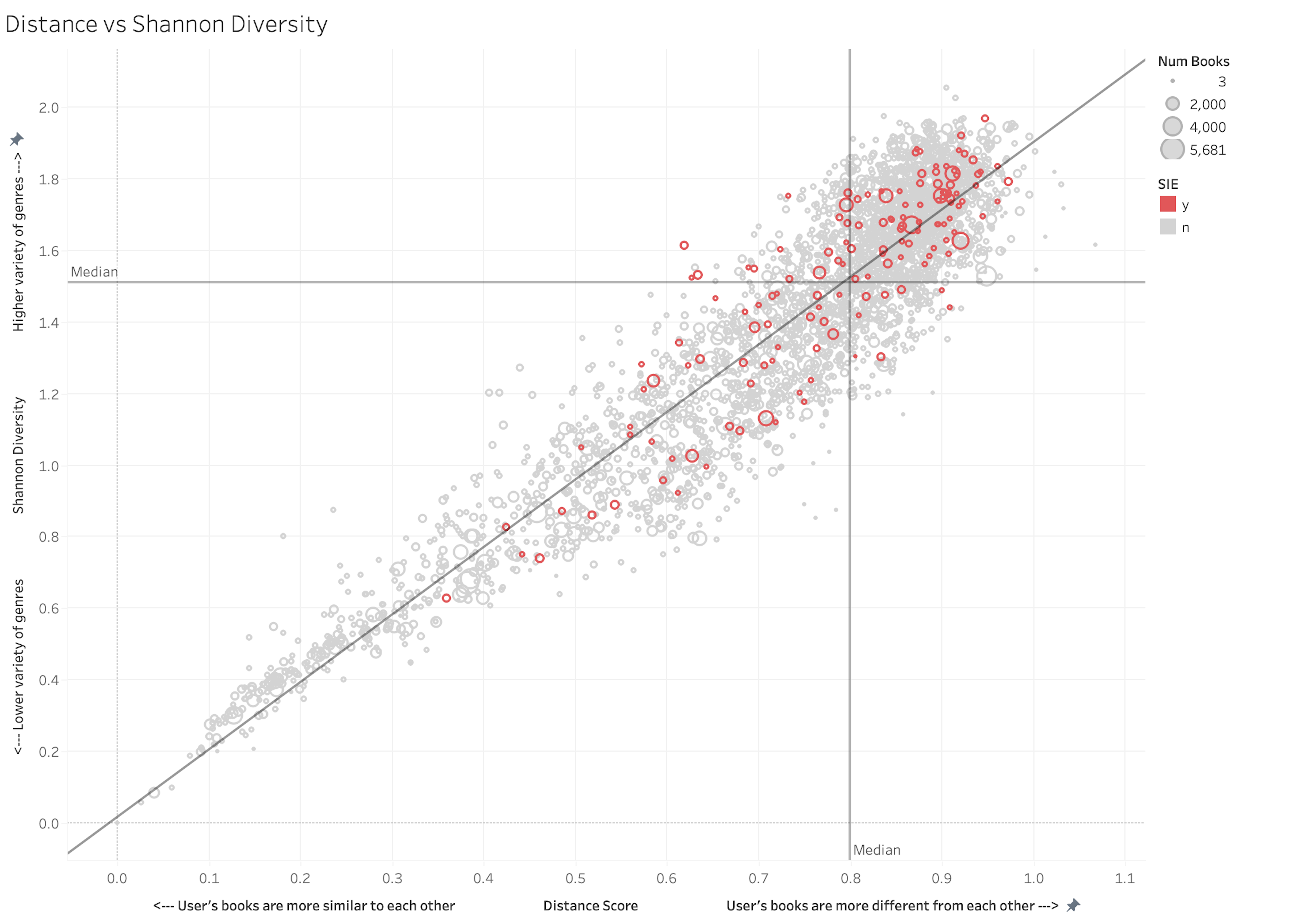 A Goodreads user like this one, who reviews the books she reads to her children at bedtime, will appear more eclectic according to our metrics than a user whose taste in adult books is exactly the same but who does not happen to read to children. It’s tempting to argue that the higher Shannon and Distance scores in the former case are a misleading distortion, since what they capture is the distance in taste between two types of reader (an adult and a child) rather than between two types of book encompassed by the taste preferences of a single reader. But why shouldn’t we treat the co-enjoyment of certain children’s books (and dislike of others) as a legitimate component of a reader’s taste, and her buying or borrowing, reading and reviewing, of those books as an important part of her cultural consumption? This may seem a minor question, but it in involves a fundamental dilemma of method regarding what to count as someone’s reading. Versions of the question might be raised about librarians who run after-school reading programs for kids, professors who look for popular recent fantasy titles to include on their first-year syllabi, or indeed anyone whose reading includes books they read for the sake of someone else or to fulfill an assigned or chosen role. Even members of book clubs could be included in this category, inasmuch as they complain about having to read books they don’t like because their fellow members chose them. Should this kind of reluctant or compulsory reading count toward eclecticism, or not?18