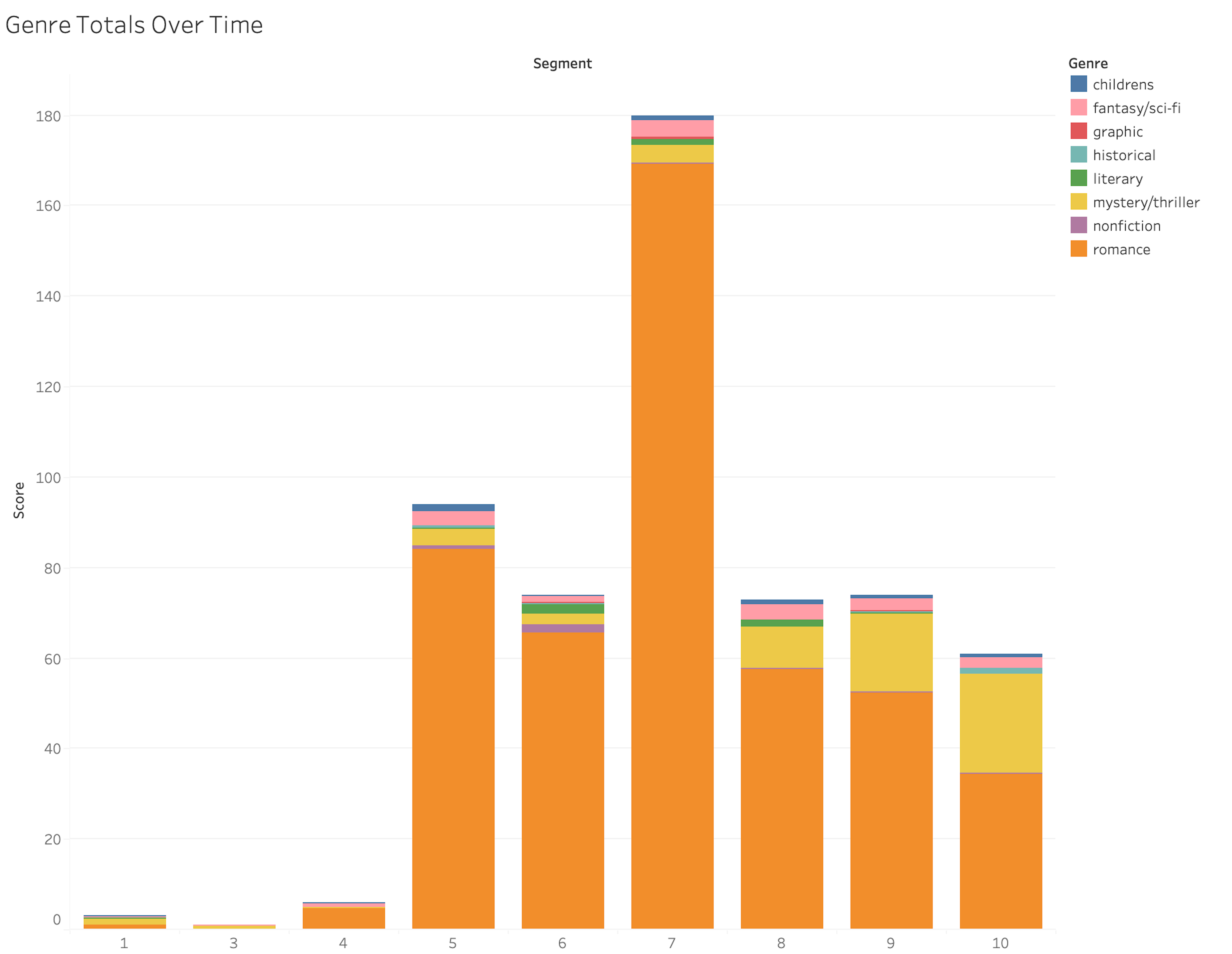 - We are visualizing the data in this alternative view because the books in this reader’s collection are distributed very unevenly over time and her preference for romance appears most starkly in the segments with the most books. If we used the same format as in Figures 6 to 9, the overall pattern would be obscured by the misleading visual equivalence of segments with 50 or 100 books and those with just a handful. ⮭