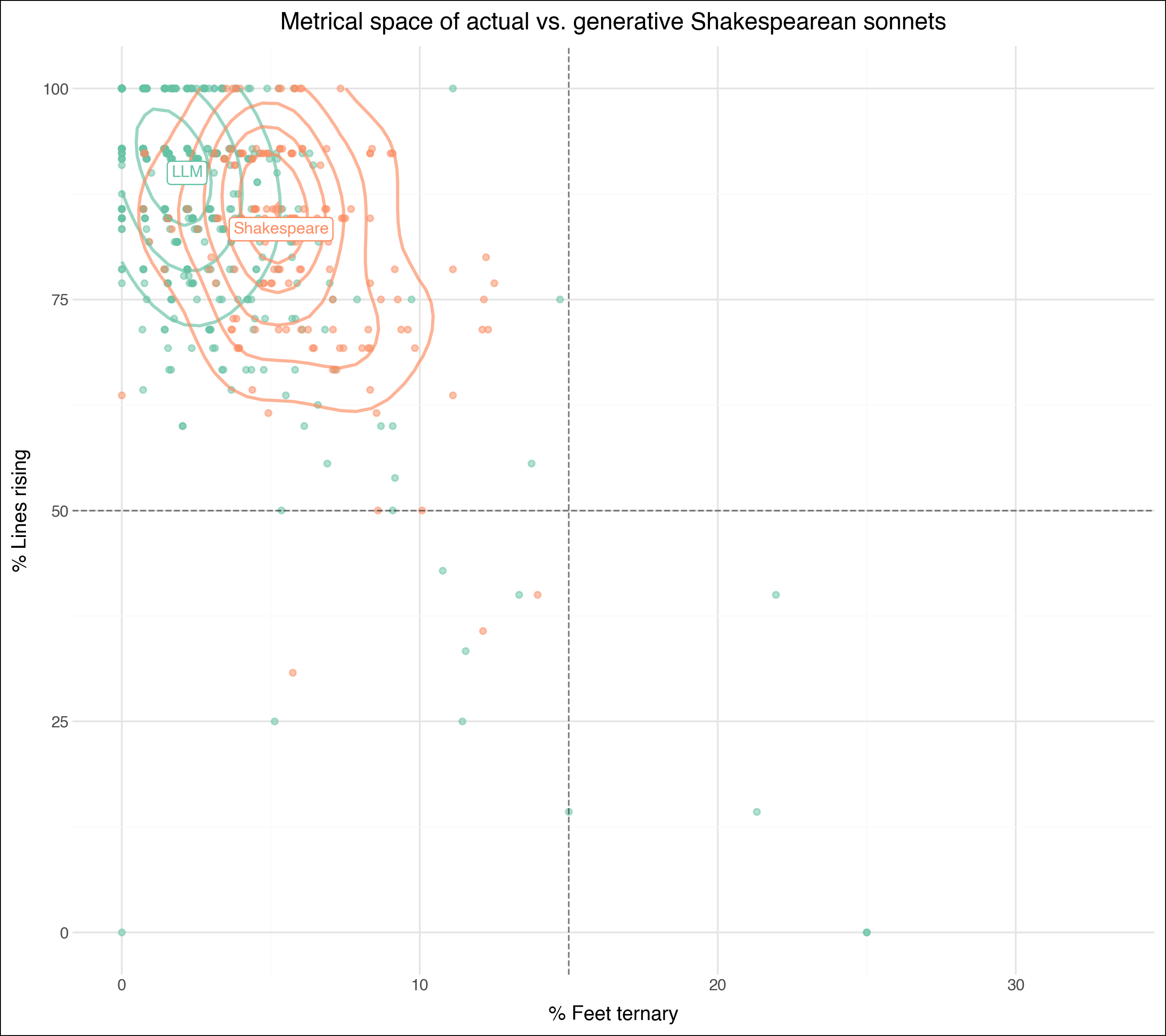 Where does generative verse fall within this metrical space? Measuring metrical regularity in generative AI imitations of Shakespeare’s sonnets, Figure 8 plots these generative texts against Shakespeare’s actual sonnets: Strikingly, LLM sonnets (in teal) occupy a metrical space far more concentrated than Shakespeare’s own. Their distribution across the metrical space occurs both in a tighter range (a kind of iambic precision) and closer to the point of total regularity in iambic meter (a kind of iambic accuracy). Prompted to imitate Shakespeare’s sonnets, and here compared with the imitated originals, these models’ hyper-regular verse again underscores the tendency of these models to produce formally conservative poetry that adheres more rigidly to the metrical forms they imitate.