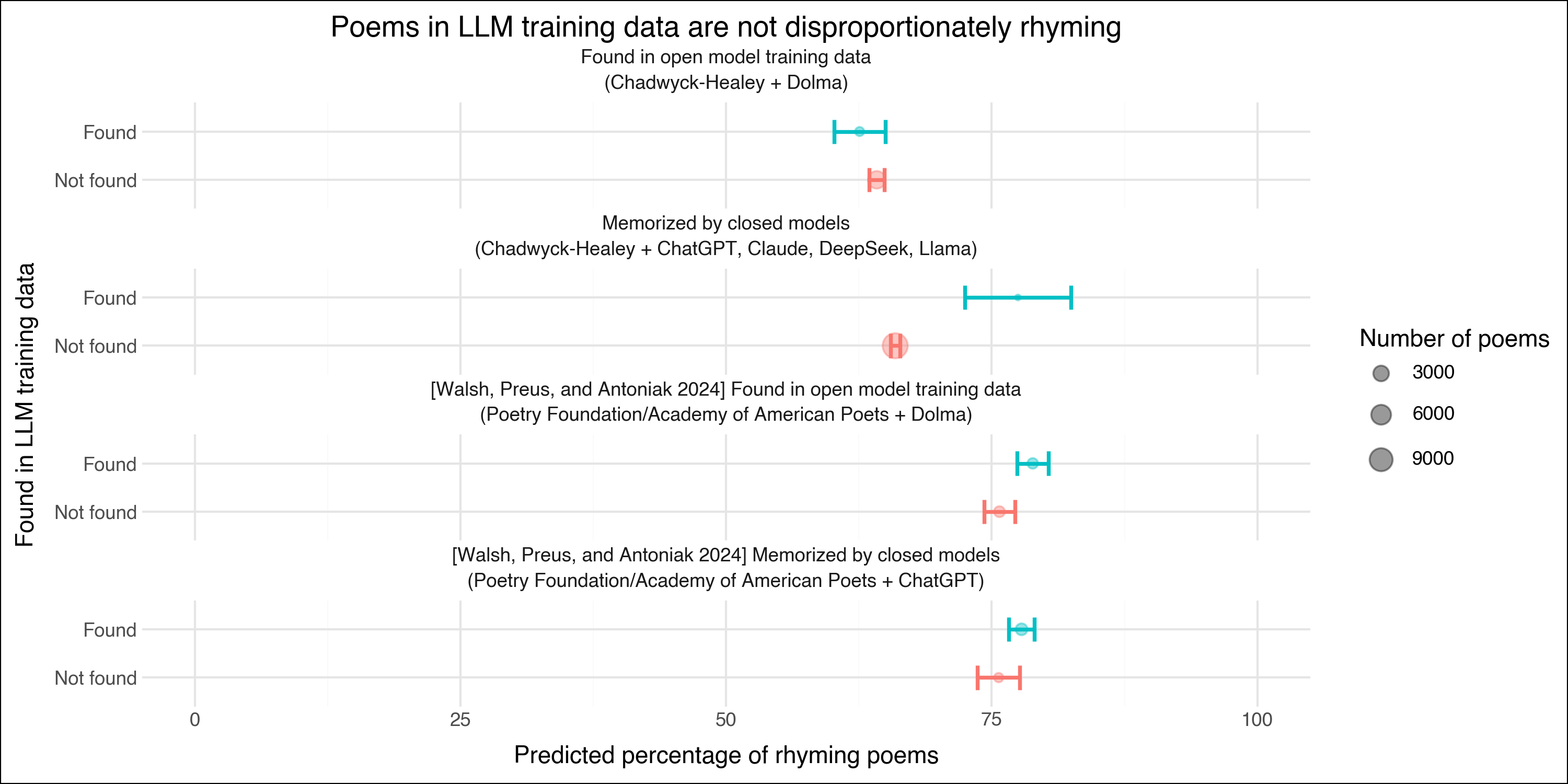 For comparison, I also reproduce similar results from Walsh, Preus, and Antoniak, who detect poems in both open and closed models by the identical procedure, in their case by querying for a more canonical sample from the Poetry Foundation (PF) and Academy of American Poets (AAP). Then, for all four cases (i.e., Chadwyck-Healey in open and closed datasets; PF/AAP in open and closed datasets), I measure rhyme in the poems discovered by these methods to be present or absent in the training data (Figure 5). Across all methods and datasets, the distribution of rhyme in poems found in LLM training data (shown in blue) is not disproportionately high compared to poems not found in that data (shown in red). A comparison of means between found and unfound poems’ rhyming shows in all cases either statistically insignificant differences or differences with small effect sizes. Moreover, though very few poems from the historical corpora used in this study were found in open LLM training data, those found even rhymed less often than those not found. These results suggest that LLMs’ tendency to overuse rhyme cannot be explained simply by an overrepresentation of rhyming poetry in their training data. Rather, this data points to something more fundamental in how these models process and generate poetic forms.
