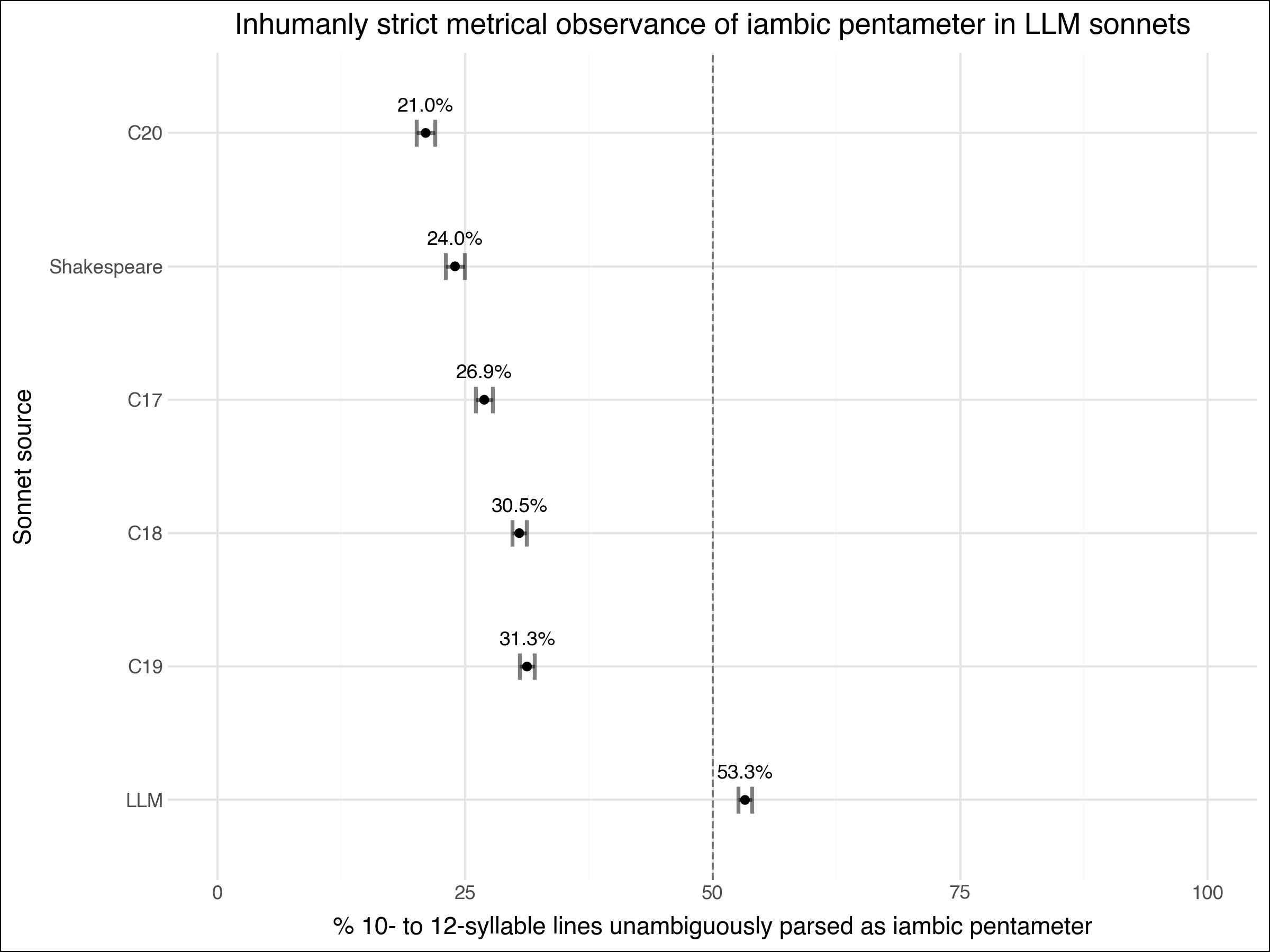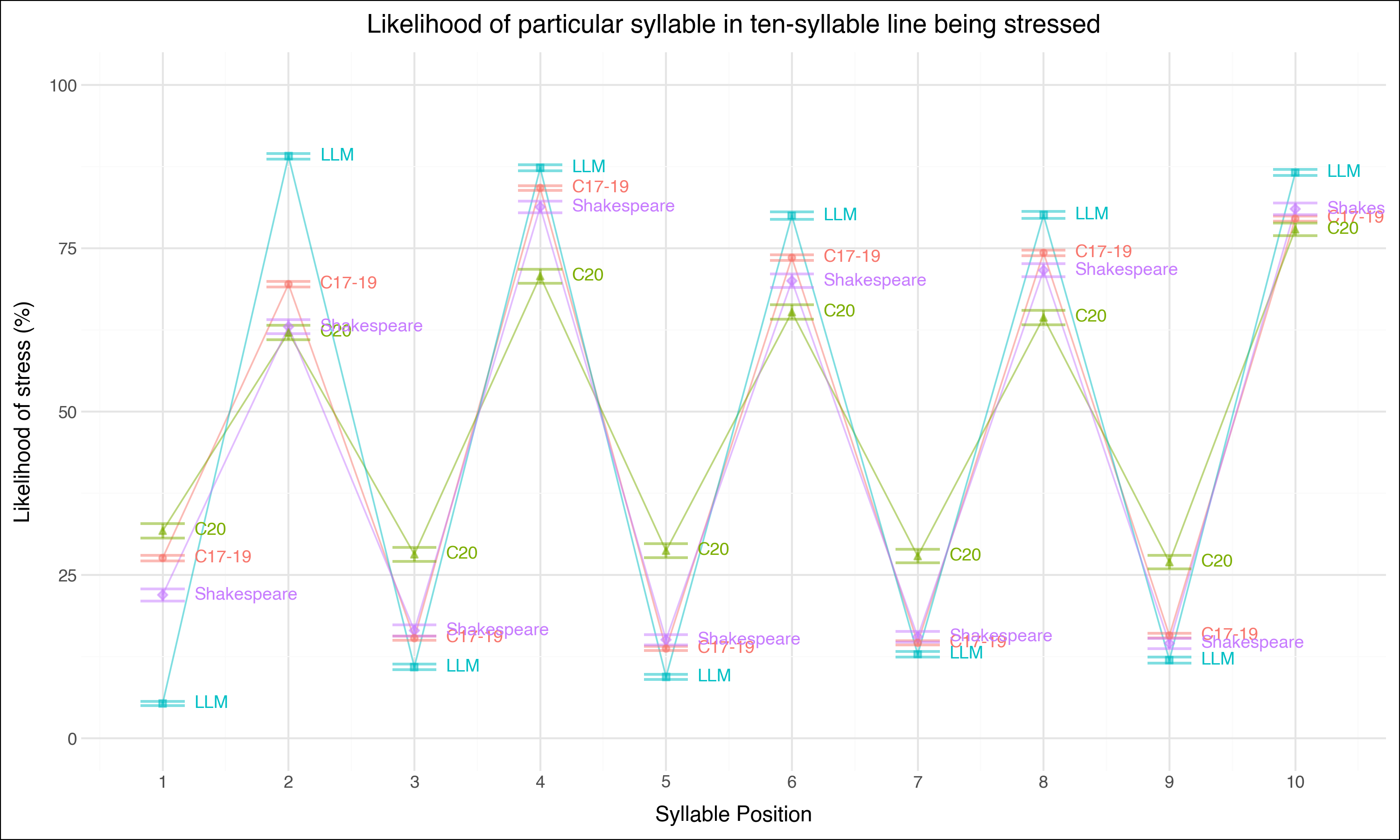 Syllable stress, however, is only the surface of poetic meter, itself an abstract template of rhythmic expectation that can accommodate wide variation in stress arrangement. Indeed, much of what we experience as pleasing poetic rhythm involves not only meeting expectations of regularity but artfully frustrating them. For this reason, a more nuanced exploration of meter in generative and historical verse must extend beyond the descriptive statistics of syllable stress into the explanatory modeling of poetic meter. The following results therefore indicate how strictly and unambiguously LLM-generated sonnets obey the formal conventions of iambic pentameter by examining the average likelihood of lines in sonnets to be unambiguously parseable as iambic pentameter. Figure 7 below shows this likelihood by sonnet source. The results reveal a striking pattern: LLM imitations of Shakespeare’s sonnets produce unambiguous iambic pentameter lines 53% of the time, far exceeding the rates found in historical sonnets. This mechanical regularity contrasts sharply with Shakespeare’s own sonnets, where only 24% of lines are unambiguously in iambic pentameter, as well as with sonnets from the seventeenth through nineteenth centuries (30%). LLM-generated sonnets produce perfect pentameter more than twice as often as twentieth-century sonnets (21%), or an “improvement” of its iambic pentameter by a factor of 2.5. By comparison, seventeenth- to nineteenth-century sonnets “improve” upon twentieth-century ones by a factor of 1.4, meaning that LLMs’ mechanical regularity exceeds even a rewinding of history from free verse to metrical tradition.