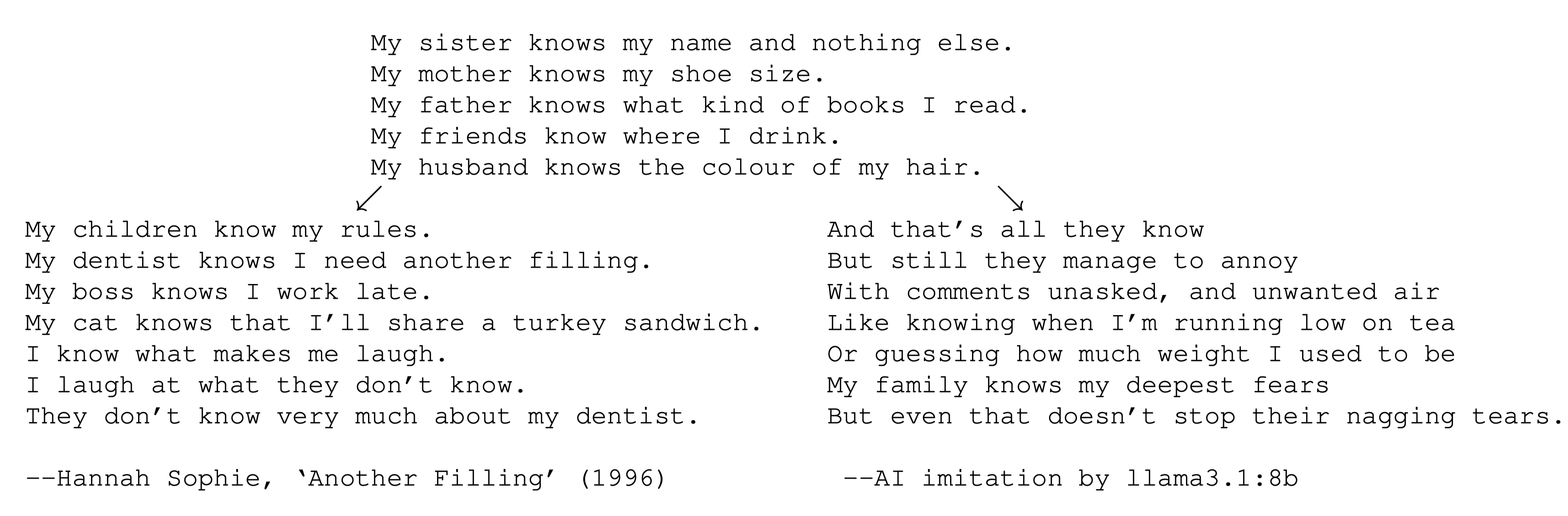 Still, given these variations across models, one might question whether the bias toward rhyme stems from the explicit mention of poetic form in the prompts themselves. Prompting not to rhyme a poem, after all, still invokes the concept of rhyme; and indeed, one of the most difficult aspects of working with LLMs is how sensitive their results are to the wording of its prompt. For this reason, I conducted a subsequent step to this experiment measuring rhyme in generative verse, this time avoiding the reliance on explicit prompting for rhymed and unrhymed verse by instead instructing models to “complete” existing poems which may or may not rhyme. For example, prompted with the first five lines of an unrhyming twelve-line poem from the 1990s, the Llama 3.1 LLM quickly veers back into rhyme (Figure 3). The first three lines of this generative imitation (shown at bottom right) continue the poem’s unrhyming form, with lines ending “know” and “annoy” (perhaps a slant rhyme) and “air”. But it then pivots into perfectly rhyming couplets, with lines ending “tea” / “be” and “fears” / “tears”. This formal pivot mirrors a thematic one, one that even brings it into contradiction with the poem’s beginning: if “My sister knows my name and nothing else” (actual), how would “My family know my deepest fears” (imitation)? The actual conclusion to the poem (“I laugh at what they don’t know. / They don’t know very much about my dentist”) surprises the reader with a touch of irony and continued banality after setting up an expectation for something more profound—an expectation eagerly satisfied by “my deepest fears” in the generative model’s completion of the poem.