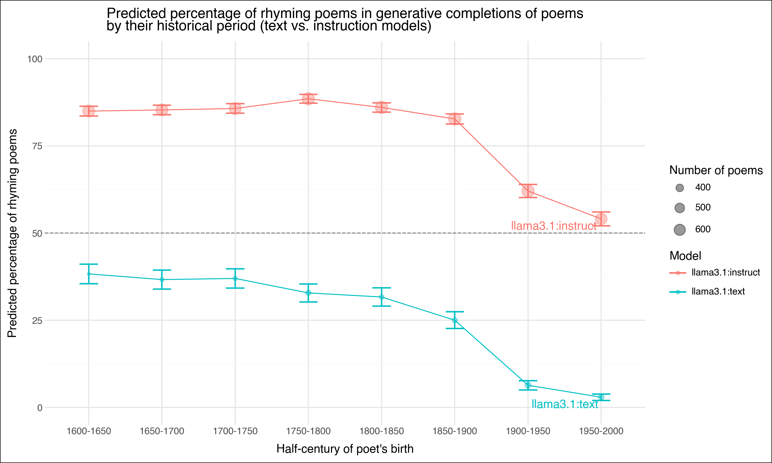 For example, preliminary experiments show that “instruction-tuning,” responsible for converting the raw next-token prediction “base models” into helpful chatbots and AI assistants, may have aesthetic side effects. Even the same model (Llama 3.1), pretrained on the same data, displays a greater propensity toward rhyme after instruction-tuning than before it. To calculate this comparison for the instruction-tuned version of the model (i.e., “llama3.1:instruct”), I used the same prompting process used above in Figure 4, in which the first five lines from poems across history are presented to models, which are instructed to “complete the poem”. The “base model” version (i.e., “llama3.1:text”), which does not respond to instructions but simply generates next tokens for the supplied context, was also shown five lines from a poem and its total number of lines. In this case, instructions were not provided, as the inherent autocompleting tendency of the model sufficed to continue the poem. The number of poems generated by both versions is shown in Table 8.