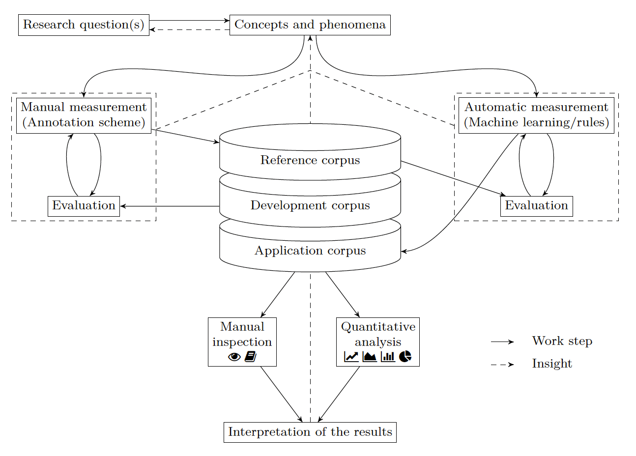 Looking closer at their operationalization workflow, the most striking difference between them is that Alfano does not perform any kind of evaluation with respect to the measurement, while both Simeone et al. and Piper are defining a test and training set and follow best practices established for data science, machine learning and computational linguistics. Apart from that, all the workflows i) start with a theoretical concept and ii) develop or apply ways of identifying its instances in a data set. This results in a measurement, which can iii) either be applied on a new, large data set or can be used to (re-)define the theoretical concepts by means such as feature importance metrics. In either case, the result is then interpreted with respect to the conceptual starting point. Figure 1 shows an idealized abstraction of the conducted workflow graphically. It is important to note that a manual annotation is not a strictly required step in this workflow: If an appropriate data set already exists, as it does in the third example, one can of course re-use it.