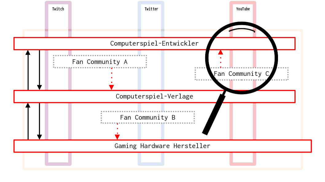 In presenting our case study, we highlight the constellations of handovers and interplay between the qualitative and computational methods. Our example originates from a PhD project that used GTM to investigate the cultural practices of gaming influencers with regard to the tension between authentic self-fulfillment, self-commodification, and consumerism. To explore these topics in the empirical data, we conducted a field assessment in which we reconstructed a model of the field structure. This model encompassed relevant types of actors, relations, and practices within the phenomenon to be explained. This model was then used to identify potential cases and data sources, which prompted the decision to use YT as the primary source (3.1).
