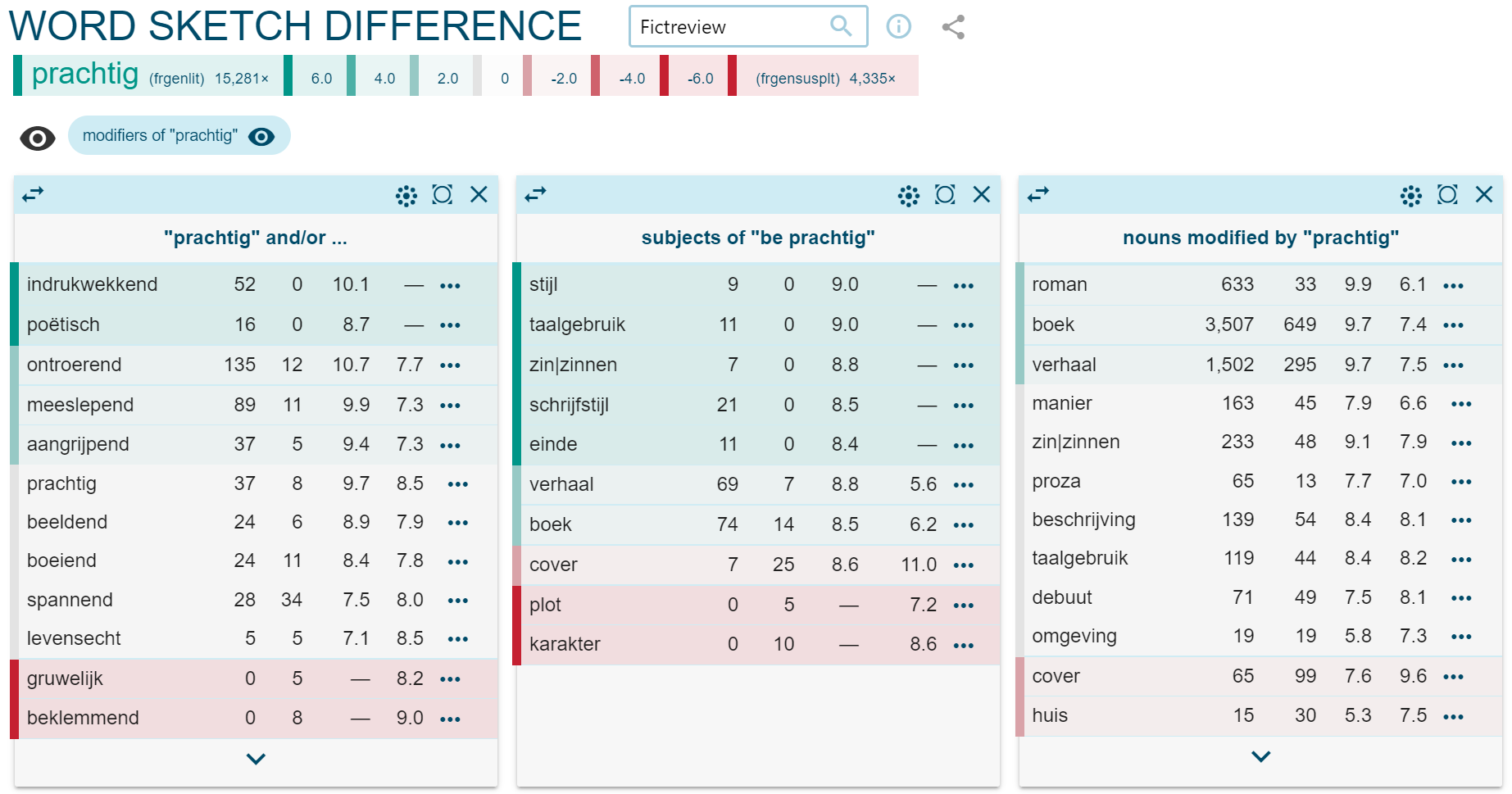 Of the collocates that do refer to reviewed aspects of the book, some refer to the linguistic aspects of the book, to the writing (‘writing’, ‘prose’, ‘language’), others refer to the story (‘story’, ‘ending’, ‘narrative’). If we assume with Jakobson that the poetic function is the essence of literary art, and distinguish distanced readers (who focus on form) from identifying readers (who focus on character and plot), it seems likely that the form-oriented words appear mostly with literary books, the story-oriented words with suspense-driven books. We can test that hypothesis by creating a word sketch difference by genre (Heydebrand and Winko). For that, we move to the Dutch corpus, as there we have subcorpora based on genre.10 We create in Sketch Engine a word sketch difference for the Dutch word ‘prachtig’ (one possible translation of English ‘beautiful’) between the literary and the suspense subcorpus. Sketch Engine shows the output as displayed in Figure 2. The words in green occur typically in reviews about literary books, the words in red occur typically with suspense novels. The numbers after the words give the frequency and (LogDice) typicality in the respective subcorpora.