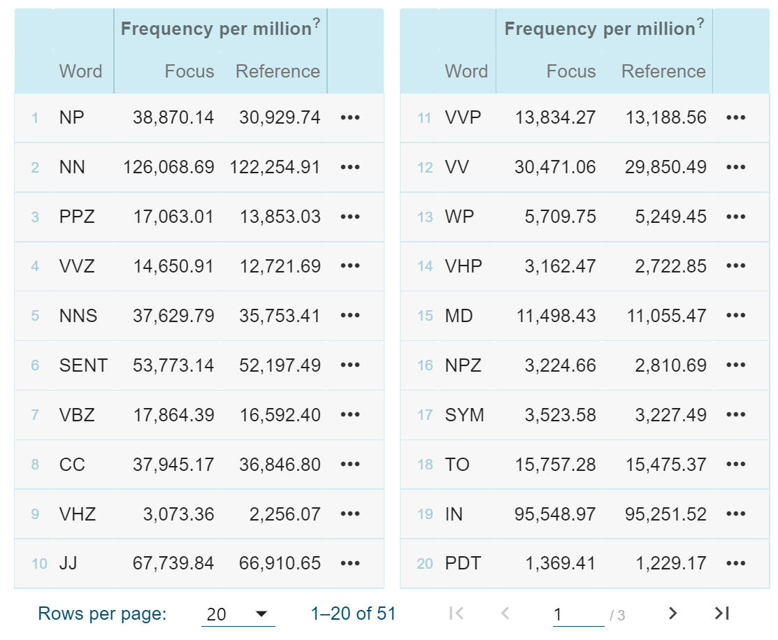 - After the first ten to twenty keywords, the differences in relative frequency quickly get so small that, while still statistically significant, it becomes hard to ascribe meaning to these differences. For the algorithm that Sketch Engine uses, see Adam Kilgarriff, “Simple maths for keywords.” Paper presented at the Corpus Linguistics Conference, 2009. ⮭