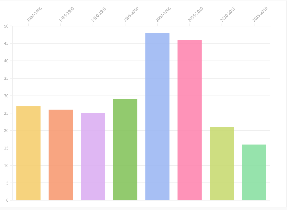 As Fig. 1 shows, the distribution of the books’ first publication year grouped into five-year spans is uneven and prevailing in the period between 1990 and 2010. The most recently published works, especially from 2010–2019, even if published during a time of high online presence, are not included or do not have a language version other than Italian on Wikipedia.