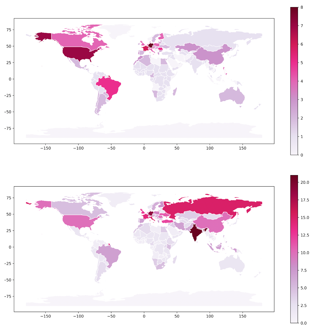 Prior works that have analyzed world-wide cultural knowledge through Wikipedia commonly focus on the largest Wikipedia editions, disregarding the long tail of medium-sized and small Wikipedias (Eom and Shepelyansky; Eom et al.; Hube et al.). This substantial reduction of the Wikipedia universe and its multi-culturality has, presumably, mostly practical reasons: for accurately identifying, e.g., entities and pages of particular types or analyzing the articles, studies often need language-specific tools, which are not yet readily available (or not easy to access) for most of the world’s smaller languages. As already mentioned, we have considered 321 Wikipedias for our study. In this way, we were able to include many small languages and dialects. The two maps in Figure 2 show how much the picture shifts as a result. We have geographically linked the Wikipedia languages back to nations where they are predominantly spoken, according to the territory-language information compiled by the Unicode Common Locale Data Repository and the geographic data provided by GeoPandas (Jordahl et al.). In particular, nations in which a large number of languages are being spoken, such as India, appear peripheral if we only consider the largest Wikipedias. The Top15-Wikipedias map presents a République des lettres mondiale that is largely coherent with the one as sketched by Pascale Casanova: The “old world” and the USA constitute a Greenwich meridian. A little bit more surprising may be that, next to it, there are Brazil, Canada, and China. The mapping of all languages shows a different meridian. While Europe is still well represented, we certainly cannot speak of “the West and the rest” anymore: India, Russia and Turkey are equally central. However, on both maps we observe the digital divide between economically more and less developed regions that has been discussed for Wikipedia (Börner and Kopf).