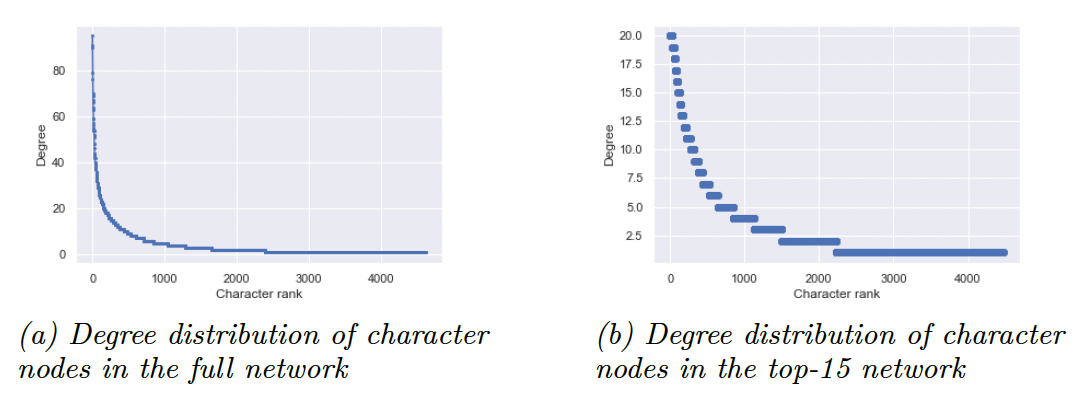 An important goal of our study is to assess the effect of including smaller Wikipedia editions into our empirical analysis. We note that a range of previous studies that aimed at assessing the centrality of entities in the Wikipedia universe still used a rather restricted set of languages ranging between the top 15 (Hube et al.) and top 25 Wikipedias (Eom et al.). Therefore, we additionally construct a reduced version of our Character-Wikipedia network that only includes the top-15 Wikipedias according to their current global size. In the following, we will use this network to compare structures and connections between characters that arise in a highly multi-lingual network to a picture that is drawn from the dominant or central Wikipedias only. In Table 1, we report some basic statistics on the distribution of nodes and links and their average degree (i.e. the average number of links of a node) in our full and top-15 network: the number of character nodes in the the top-15 network is reduced from 4623 to 4240, i.e. only 383 characters get removed from the network when removing 166 languages and keeping only the top 15 Wikipedias. This shows that, overall, most of the characters retrieved from Wikidata and Wikipedia by our querying-based approach seem to be represented in the large Wikipedias. Consequently, the top-15 network is very dense, as indicated by the average degree k and the average degree of the Wikipedia nodes kwiki.