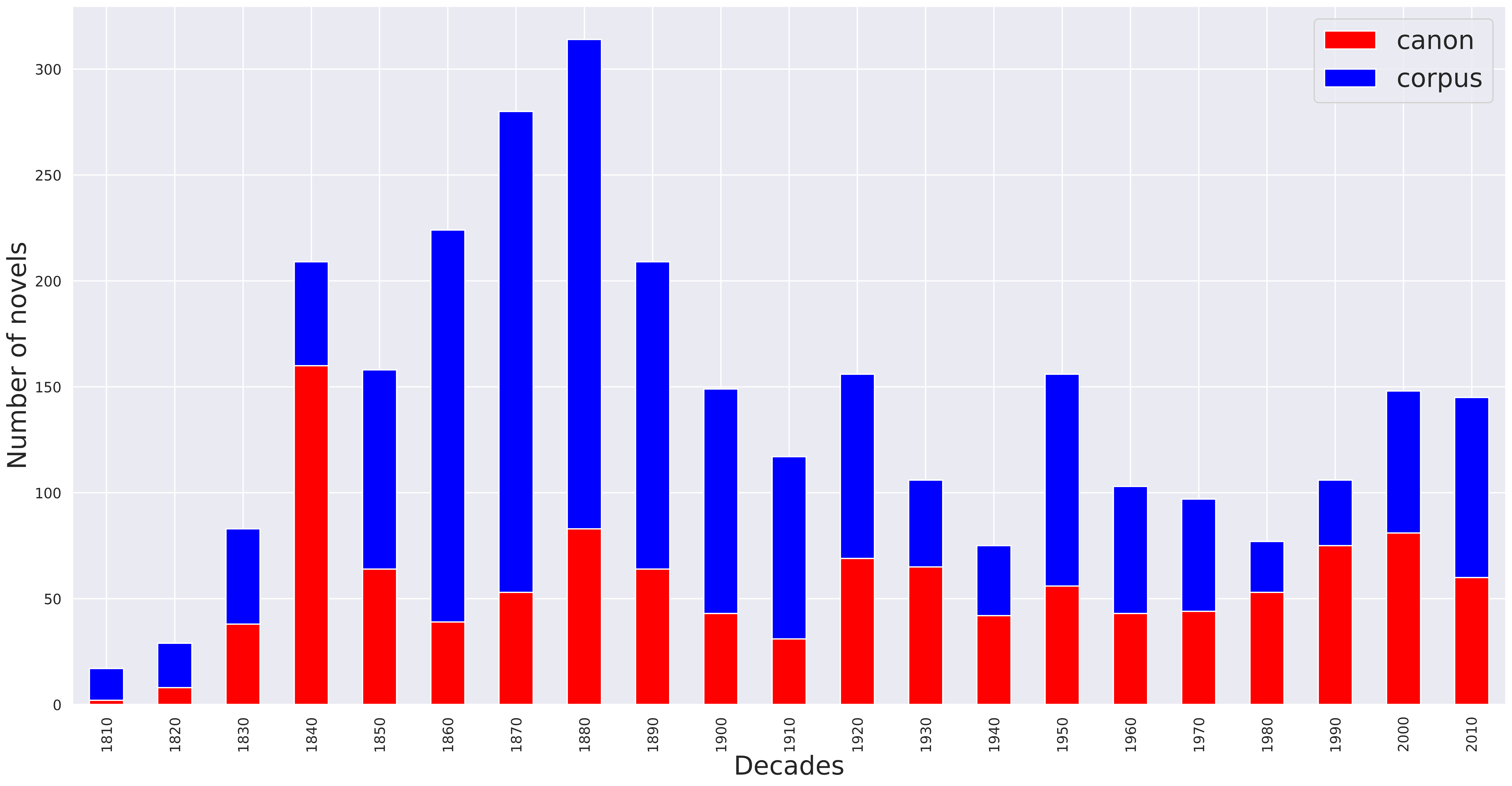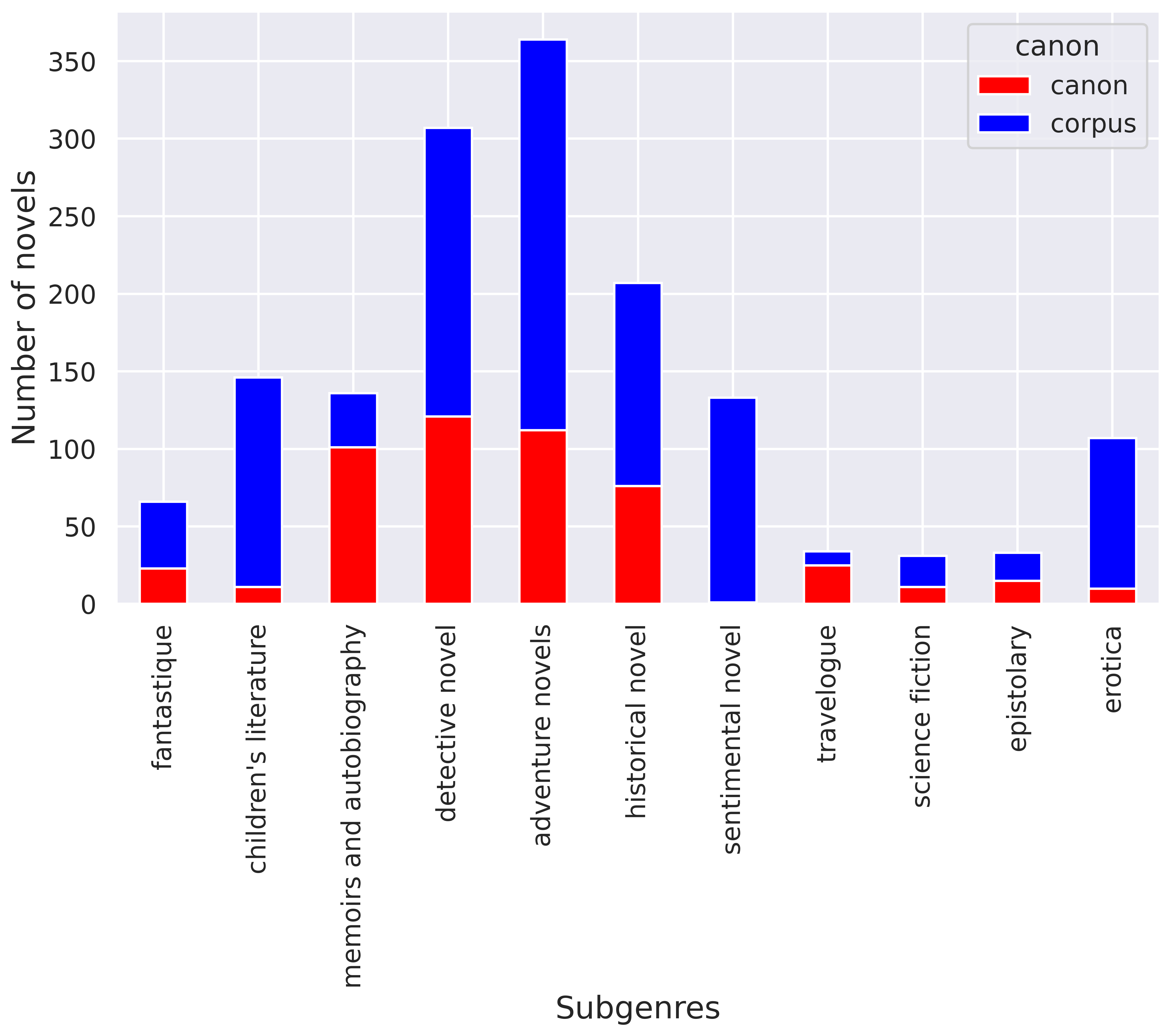 We believe that the non-canonical works in the corpus are a good sample of what the archive may have been, not only by their number – they account for nearly 90% of the novels at the novel scale, and 65% at the author scale – but also by the diversity of the sub-genres represented.