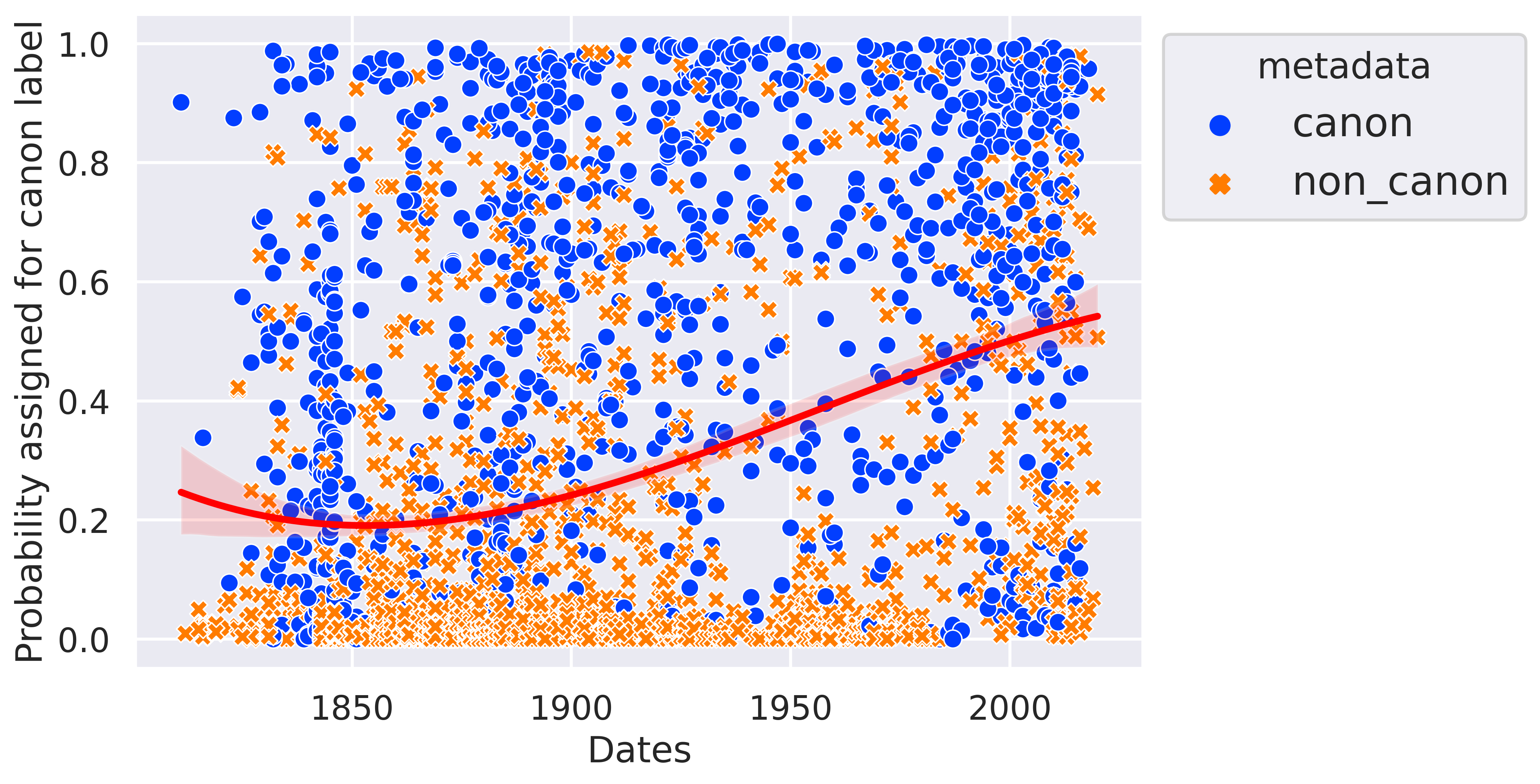 The red non-linear regression is fitted on the predicted probability for each text to be canonical. This prediction is retrieved from the test set, meaning that the model has seen neither the novel in question nor the writer’s other works. There is a huge increase in this probability over time, from 0.2 to 0.6 while it should be around 0.5 since our dataset is balanced. This result is discussed in the next section.