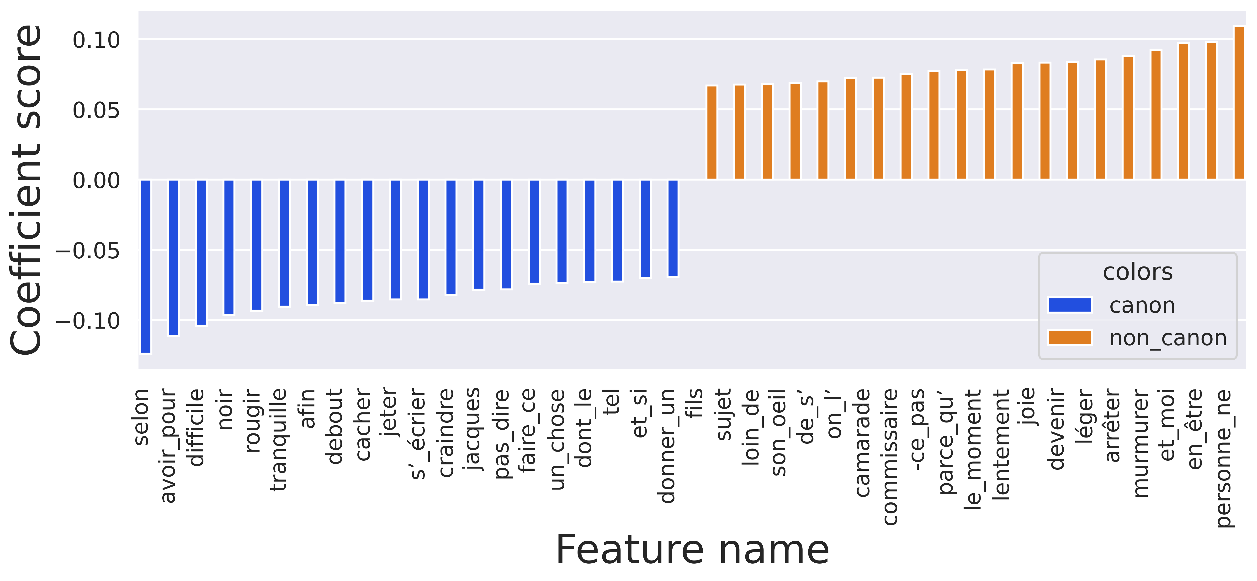 One of the fundamental benefits of machine learning for the field of literary studies lies in the ability to delve into the inferences made by models, shedding light on the intricate mechanisms that drive their predictions. We retrieved in figure 6 the 40 most discriminating features for the model. The coefficients derived from the predictive model offer intriguing insights into the factors that contribute to the classification of works as either canonical or non-canonical. Examining the elements associated with non-canonical labeling, a distinct pattern emerges. Certain ngrams such as “personne ne” (nobody), “en être” (to be in it), and “et moi” (and me) appear frequently. These phrases, while seemingly innocuous, often characterize colloquial language or informal dialogue. Their prevalence may reflect a tendency towards more mundane or everyday narratives. Similarly, words such as “murmurer” (to murmur), “arrêter” (to stop), and “devenir” (to become) hint at simpler action-driven narratives, often prevalent in genres like adventure or detective fiction. Notably, specific subgenre affiliations can also be deduced from the coefficients. The presence of words such as “commissaire” (detective) in non-canonical labeling might be indicative of works associated with crime or detective intrigue, genres that may be deemed less canonical due to their distinct narrative priorities. In contrast, canonical labeling features words such as “jacques” (a proper name) or “fils” (son) which may allude to more character-driven narratives.