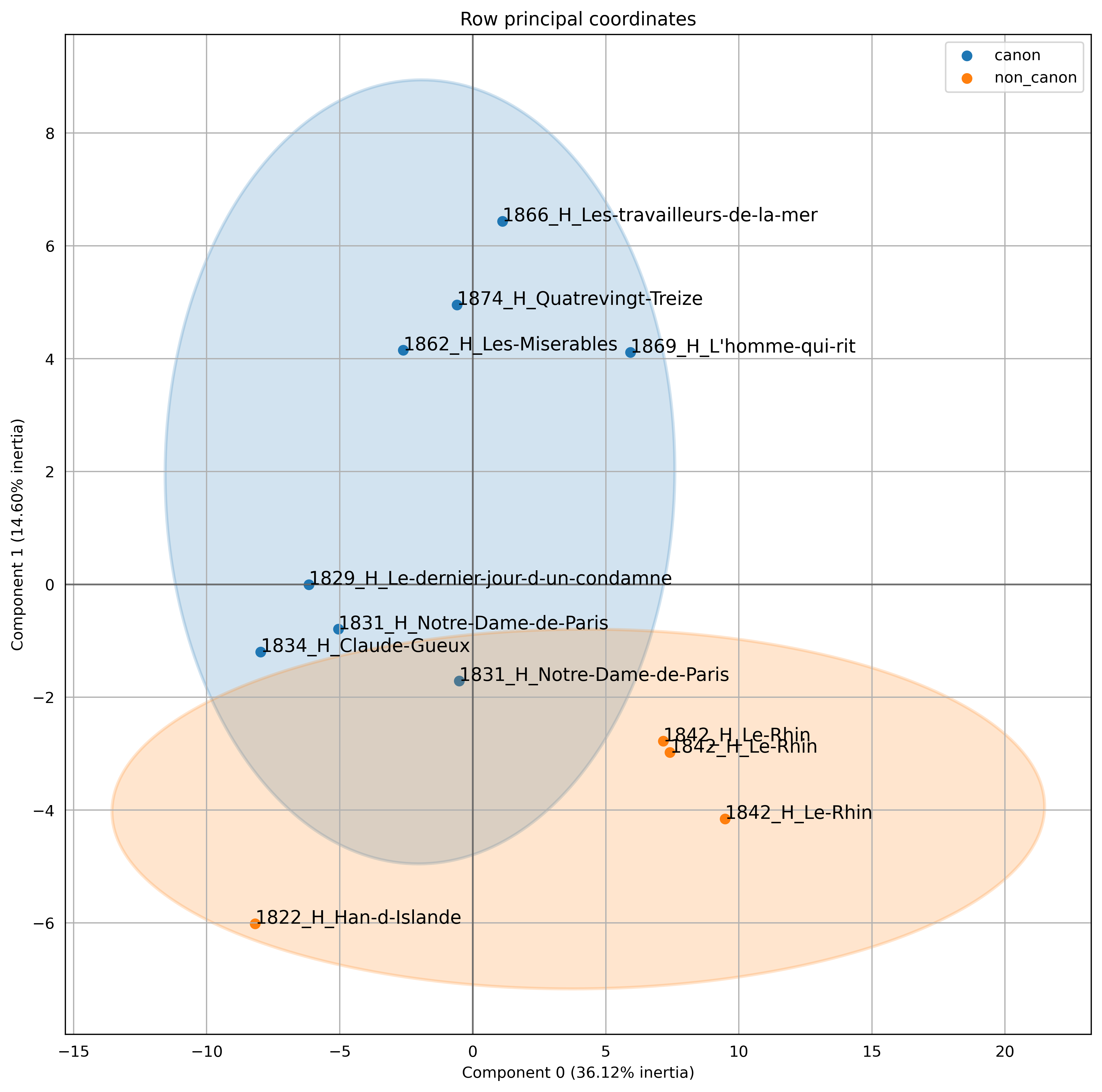 Victor Hugo is one of the most famous and canonical French authors. Not all his writings are equally canonized, however, and some of his novels tend to be forgotten. This is the case for Han d’Islande, an early novel by the young Victor Hugo, and for Le Rhin, a travel guide with stories about the Rhine river, published in 1842. The three volumes of Le Rhin present in our corpus are unsurprisingly very close. Once again, the PCA detects the signature of the author’s chronolect, roughly describing two writing periods of Hugo, the first around the 1830s and the second during the author’s later period (see figure 8). The two non canonized novels are at the margin of the idiolectal signature of Victor Hugo, and stand out from the canonical selection.