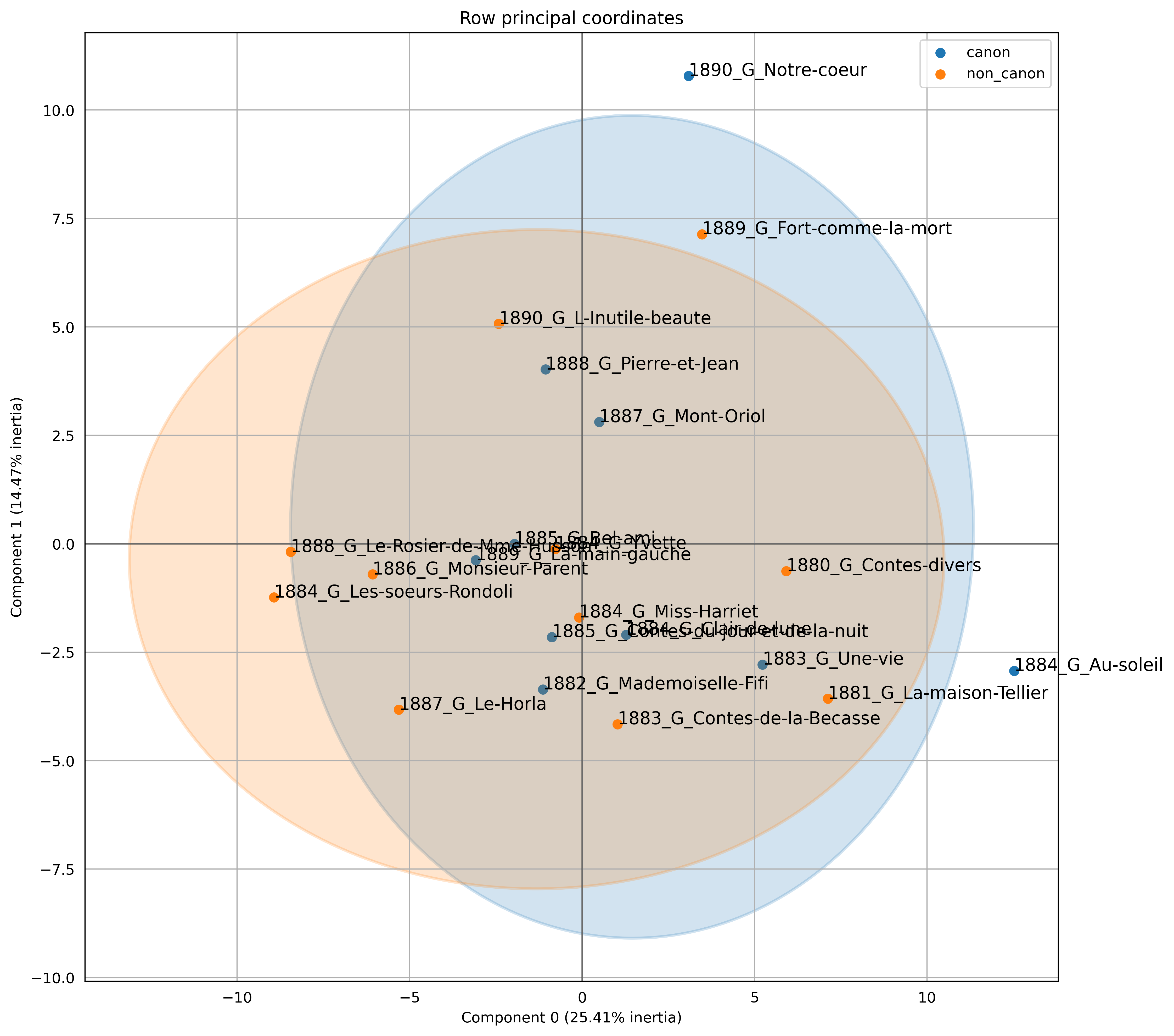 It is important to note that this experiment does not work for all our authors, as evidenced by the example of Guy de Maupassant’s works, shown in Figure 9: He was a very productive author, and the PCA visualization fails to separate canonical from non-canonical texts.