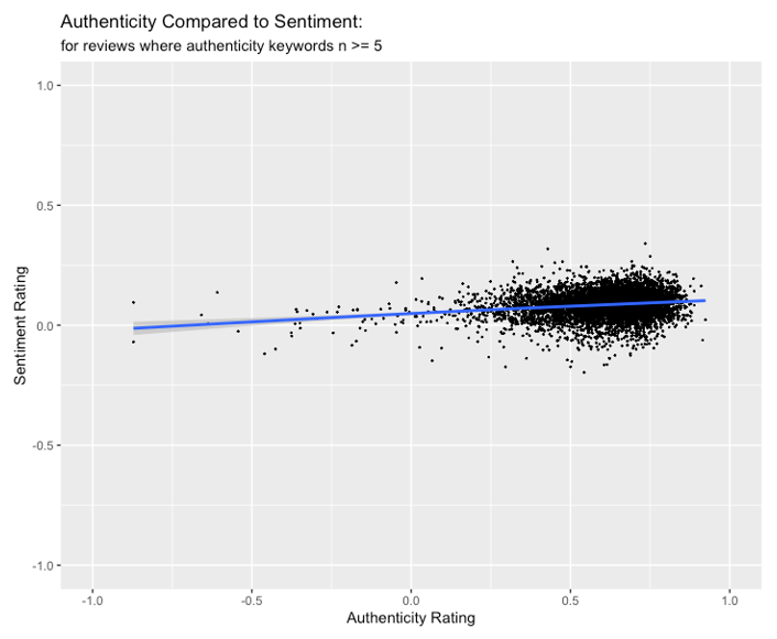Sentiment was analyzed at the review level using a lexicon-based approach. Using the sentimentr package in R, I computed the sentiment of each review with the included “Jockers-Rinker” lexicon modified to remove all terms which also appeared in the authenticity lexicons (Rinker). The authenticity type lexica were also loaded into sentimentr and used to compute an authenticity score for each review reflecting the overall valence of the authenticity type terms present in the review. An advantage of using sentimentr for computing authenticity and sentiment scores is that it uses a rule-based approach to detect negation, downgraders, upgraders, and other lexical items which can contribute to or modify sentiment in the text. In addition, I approximated a general authenticity score for each review by taking the average of the authenticity subtype scores. To make the authenticity and sentiment scores more comparable, I rescaled all scores between 1 and -1. Finally, I used linear regressions to predict the relationship between authenticity score and sentiment.