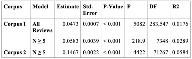 As can be seen from table 1 and fig. 3, this improved the model considerably. Expanding the size of the data set allowed for a slightly larger R2, smaller standard deviation, and showed stronger effect of authenticity on sentiment. These results show that the average authenticity rating of a review increases as the sentiment rating increases. This means that the more positive authenticity words are present in a review, the more the writer of that review uses positive language overall. This finding adds to the body of research which has found numerous positive outcomes for organizations attached to an increased perception of authenticity, such as O’Connor et al. and Lehman et al.