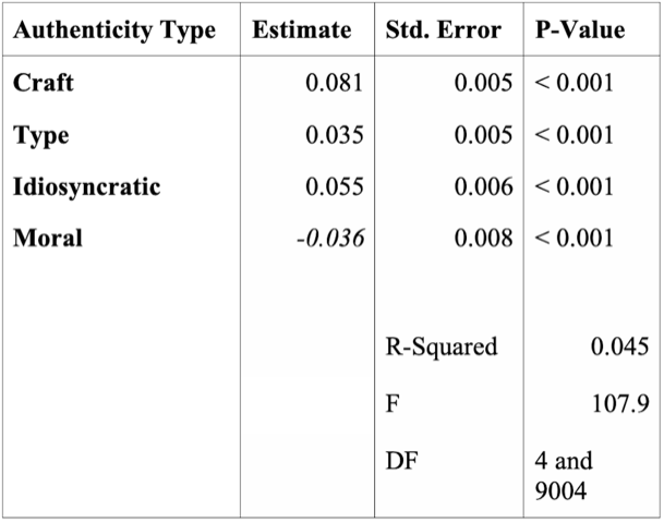 Different types of authenticity also showed different contributions to the overall sentiment polarity. As expected, craft authenticity showed the strongest impact on sentiment, while contrary to earlier findings, moral authenticity had a small negative impact on sentiment. The potential reasons for this are varied, and likely it is a combination of factors: both the fact that negative reviews are more likely to discuss agents and issues of moral behavior, as well as the domain specific meaning of some of words in the moral authenticity lexicon, such as decent.