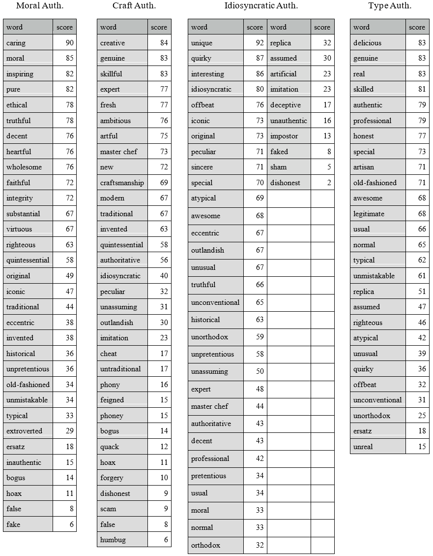 The motivation of management studies to quantify consumer perceptions of authenticity reflected in textual data has largely been to understand its effect on value judgments and consumer satisfaction. The model adopted for the quantitative analysis in this article divides authenticity into four subtypes: type, moral, idiosyncratic, and craft authenticity. Type authenticity relates to fidelity to genre or archetype, whereas moral authenticity describes an evaluation of the sincerity of the views and choices expressed by individuals or organizations. Closely related to type authenticity, craft authenticity is tied to the skill and quality of production, while idiosyncratic authenticity concerns the perceived uniqueness and quirkiness of an organization or product, tying it to moral authenticity (O’Connor et al. 3–4).3
