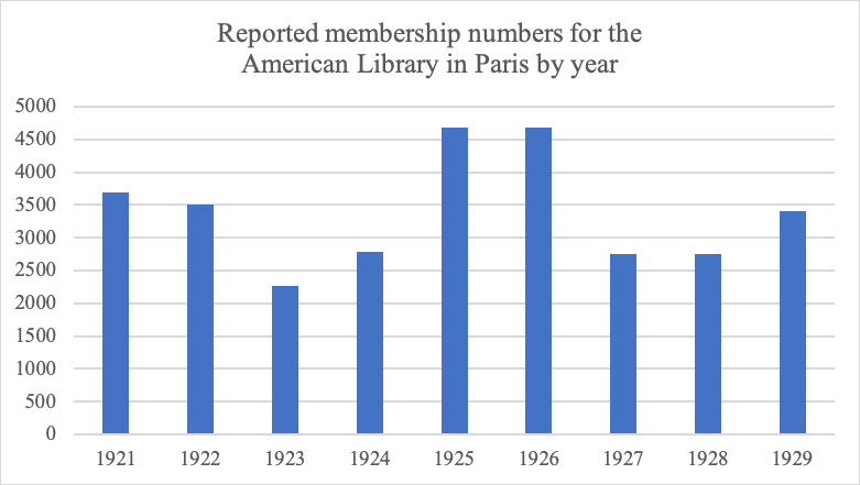 The most concrete distinction between the two institutions was their size. Beach described her shop—a former laundry—as “two rooms, with a glass door between them, and steps leading into the one at the back” (Shakespeare and Company 17), while the dramatically larger American Library was, in its early years, spread over three floors of a “beautiful old hotel” (“Some Facts” 201). The differing scales of these physical spaces was matched by their membership numbers and holdings. In 1926, during the population peak of Paris’s American colony, the ALP claimed 4387 cardholders, while the Shakespeare and Company Project (SCP) records only 249 members at Beach’s library (fig. 1).7 That year, the ALP reported 37,071 circulating works, while, in contrast, the SCP data has identified around 6,000 titles available for loan during Shakespeare and Company’s twenty-plus-year existence (1919–1941).8 While Shakespeare and Company, thanks to its intimate connections to the era’s most famous writers, is the Paris-American library that has attracted the most attention, these differences in size and scale are reminders that Beach’s library represented just a fraction of the city’s exchange of English-language books.9