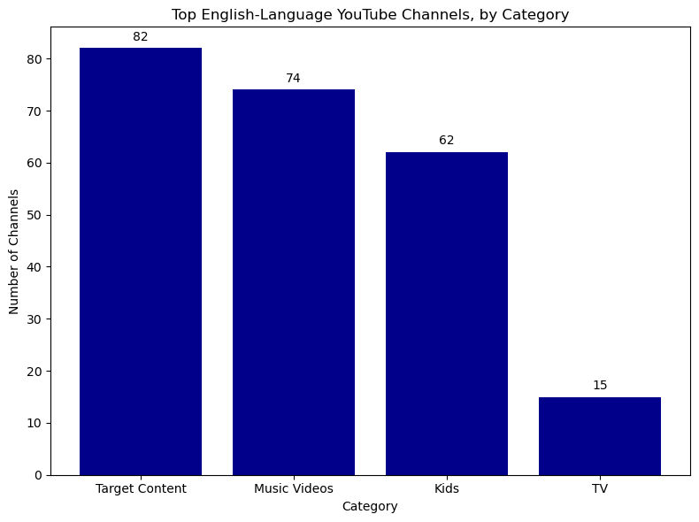 For the YouTube videos, we repeated a similar process with some distinctions. First, all available top listings were extracted from the Internet Archive, 2012-2023. Next, a master-list of 378 top creators—or channels—was culled, with subscribers ranging from 500,000 (in 2012) to 250 million (in 2023).6 Channels were then filtered to exclude non-English channels. I again used the same process of reading each channel’s description, scanning all titles/captions of videos produced during the top-ranked years, and watching three randomly selected videos. (In the context of YouTube, I did not need to watch five videos for any tricky cases.) When non-English channels were removed, 230 remained. Here, however, one other step of channel-filtering was also performed. When examining the channels, it became clear that many—like “CocoMellon Nursery Rhymes” or “Like Nastya”—were oriented toward very young children or toddlers. (TikTok channels, by contrast, often felt geared toward teenagers, but not toddlers.) Others were channels that predominantly posted minimally re-packaged content from or associated with prior media, like music videos or largely-unaltered TV clips (e.g., on the BBC channel). During the process of filtering the channels by language, therefore, I also identified and labeled these other types of channels. If a channel appeared to be devoted primarily to content for young children, and all three examined videos fit this description, I labeled the channel “Kids.” If a channel appeared to be devoted primarily to music videos, and all three videos fit this description, I labeled it “Music Videos.” If a channel appeared to be devoted primarily to largely unaltered TV clips, and all three videos fit this description, I labeled it “TV Clips.” I decided to remove the Kids, Music Videos, and TV Clips channels prior to subsequent analysis—though this was, admittedly, a judgment call—in order to target the sort of adult/adolescent-oriented or “platform specific” content that one might have in mind when asking about historically emerging forms of “viral” or popular video (or, at least, that I had in mind). That said, it should be noted that these types of excluded channels comprise a large proportion of top-ranked, English-language channels on the platform—indeed, more than half of those that I surveyed (148/230) (see Figure 1). Once these channels were removed, 82 remained.