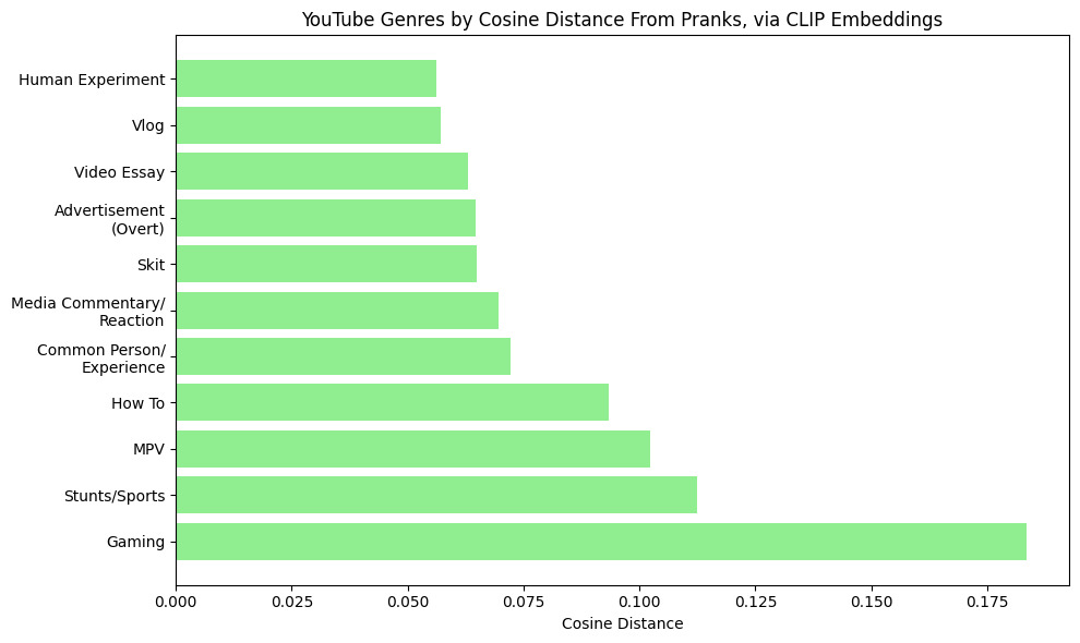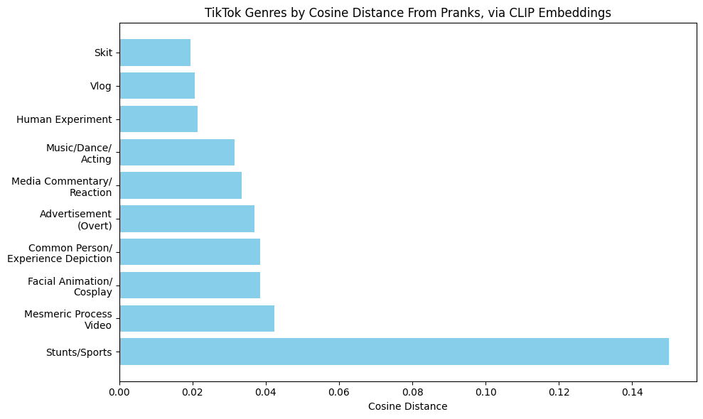 How do the pranks appearing in this data mirror genres appearing across the broader sets? Though extensive distant reading is beyond this essay’s scope, one computational method can help us assess the genre’s connections to one another. To begin to probe cultural distances (metaphorically speaking) between the pranks and other genres in the two genre-labeled target sets, I scraped the videos using yt-dlp (a less storage intensive process than scraping the full collections at an earlier stage).17 Of the “live” 551 videos in TikTok set 2, twelve could not be scraped (they were dispersed across genres); of the 489 “live” videos in YouTube set 2, five were not scrapeable (and were also dispersed). I grouped the scraped videos by genre label, separately for each platform; I then generated embeddings for each video belonging to each genre using an OpenAI CLIP model (CLIP ViT-B/32) on eight uniformly-spaced sample frames per video. Frame-embeddings were averaged per video and then within each genre; cosine distances between the genres were then calculated to determine which genres were “closest” to pranks. The results appear in Figures 6 (TikTok) and 7 (YouTube).