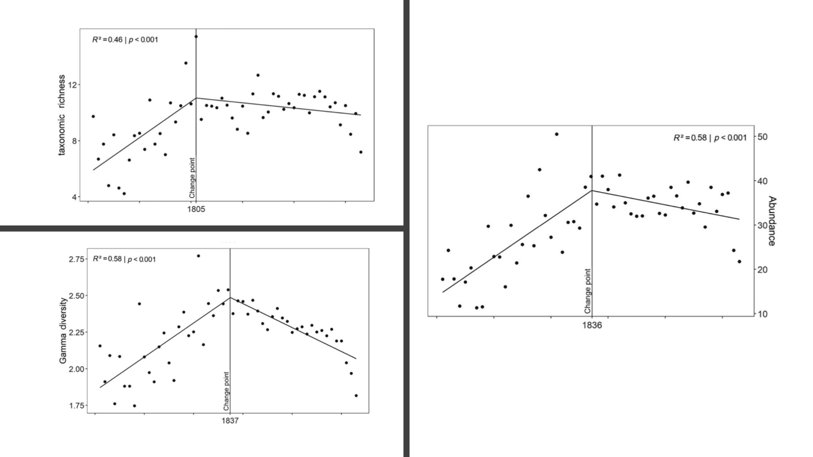 As we can see in Row 1 of Figs. 4-6, the implementation of the DB method applied to the PG dataset partially replicates the results of Langer et al. The estimated breakpoints are consistently earlier, but I either find no rise in the number of estimated taxa or a decline of diversity similar to the original paper.