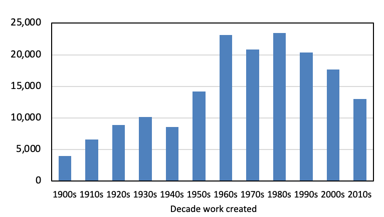 The move away from traditional art forms can also be seen in my dataset. If we look at those collections which classify work by art form, we find that painting dominated in the first half of the twentieth century, with paintings created in the 1900s or 1940s accounting for around 80% of the total, and for all other decades from the 1920s to the 1950s around 70% of all works. Since then the proportion of all works that are paintings has fallen consistently and substantially to 36% of works created in the 2010s.5