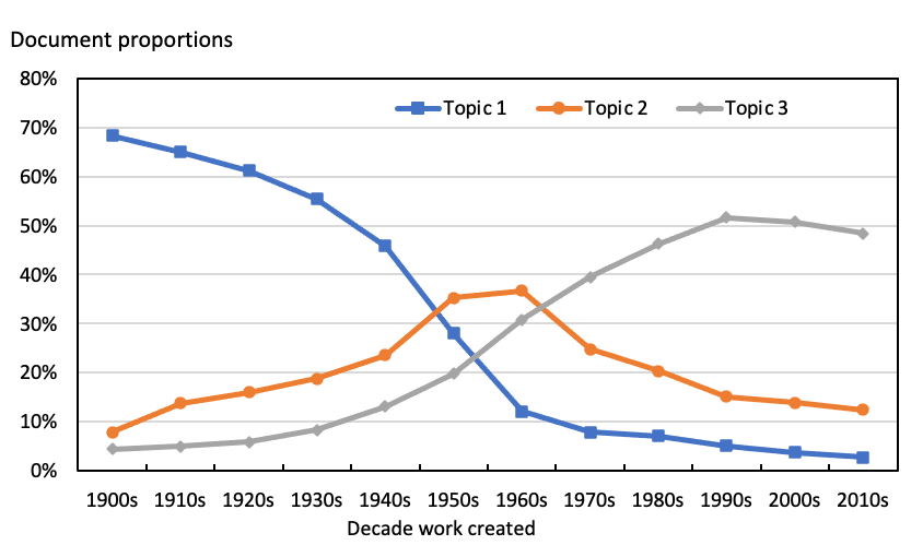 My model is dominated by three topics. For the titles of artworks created in every decade from the 1900s to the 2010s the most prominent topic in the model is one of those three topics, their combined weight is never less than 60%, and for all decades bar the 2000s and the 2010s they represent three of the four topics of highest weight. No other topic is significant in the model for more than two decades. Plotting the weights of the three dominant topics by time shows an inter-woven cyclic pattern of change, as presented in Figure 2. The first topic, ‘topic 1’, dominates in the models for the titles of artworks created in the early decades of the twentieth century. ‘Topic 2’ rises to be the most prominent in the models for the titles of artworks created in the 1950s and 1960s before declining. ‘Topic 3’ is the most prominent for the decades from the 1970s to the 2010s, although, as can be seen from Figure 2, its importance has also fallen back in recent decades.