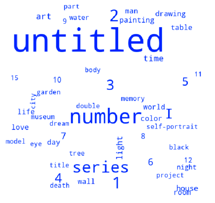 ‘Number’ is the word of highest weight in topic 2 and the numerals 1, 2 and 3 also feature in the top 50. Numerals can function to identify or to order. However, topic modelling does not allow these uses to be distinguished as it takes no account of the order of the words in the documents being modelled. The title ‘Number 1’ might signal a desire to minimise or eliminate the title’s semantic role as something contributing to the work’s meaning, restricting its function to the nominative one of identification. In contrast, the words ‘Number 1’ in the title ‘Compositions in Red and Blue Number 1’ might indicate a work to be seen as the first of a sequence and so have a significant semantic function. To understand how the word ‘number’ and numerals functioned we need to look at their presence in whole titles, not just as individual word tokens. I will come on to this later in this article.