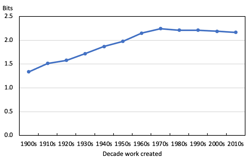The art historical value of the topic model is not limited to that provided by the most prominent topics in each decade and the most important words in those topics. The overall distributions of topics in the model for the titles of works created in each of the decades from the 1900s to the 2010s can give an indication of the diversity of titling practice in each period and how that has changed over time. The more diverse the titles used by artists the more topics there will be of significant weight in the model for that period to capture that variety. Conversely, the more titling is centred upon a limited set of words, the more the topic model will be concentrated in a few topics of high weight. A succinct measure of diversity or complexity in this sense of the degree of concentration of the weights in a topic distribution is its entropy, which has been used by a number of scholars to look at questions of cultural or linguistic complexity (Juola; Lincoln; Chen et al.; Rasterhoff et al.; Long 135–40). The entropy of a distribution can be thought of as the number of bits required to characterise it. The higher the entropy the more spread the distribution and the more bits required to characterise it.