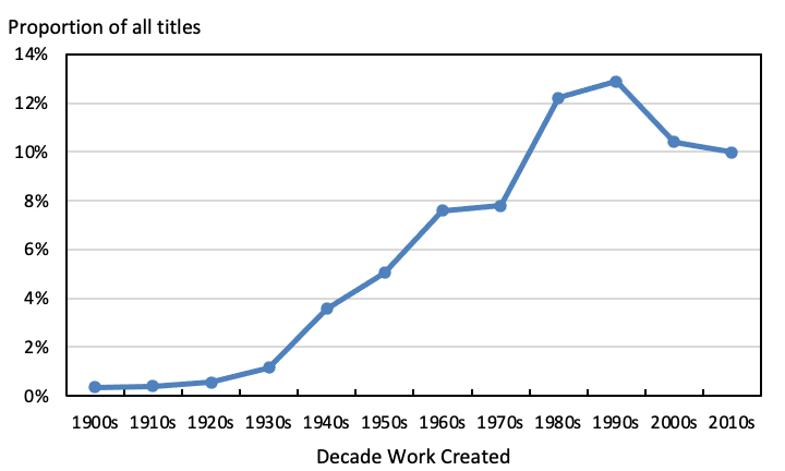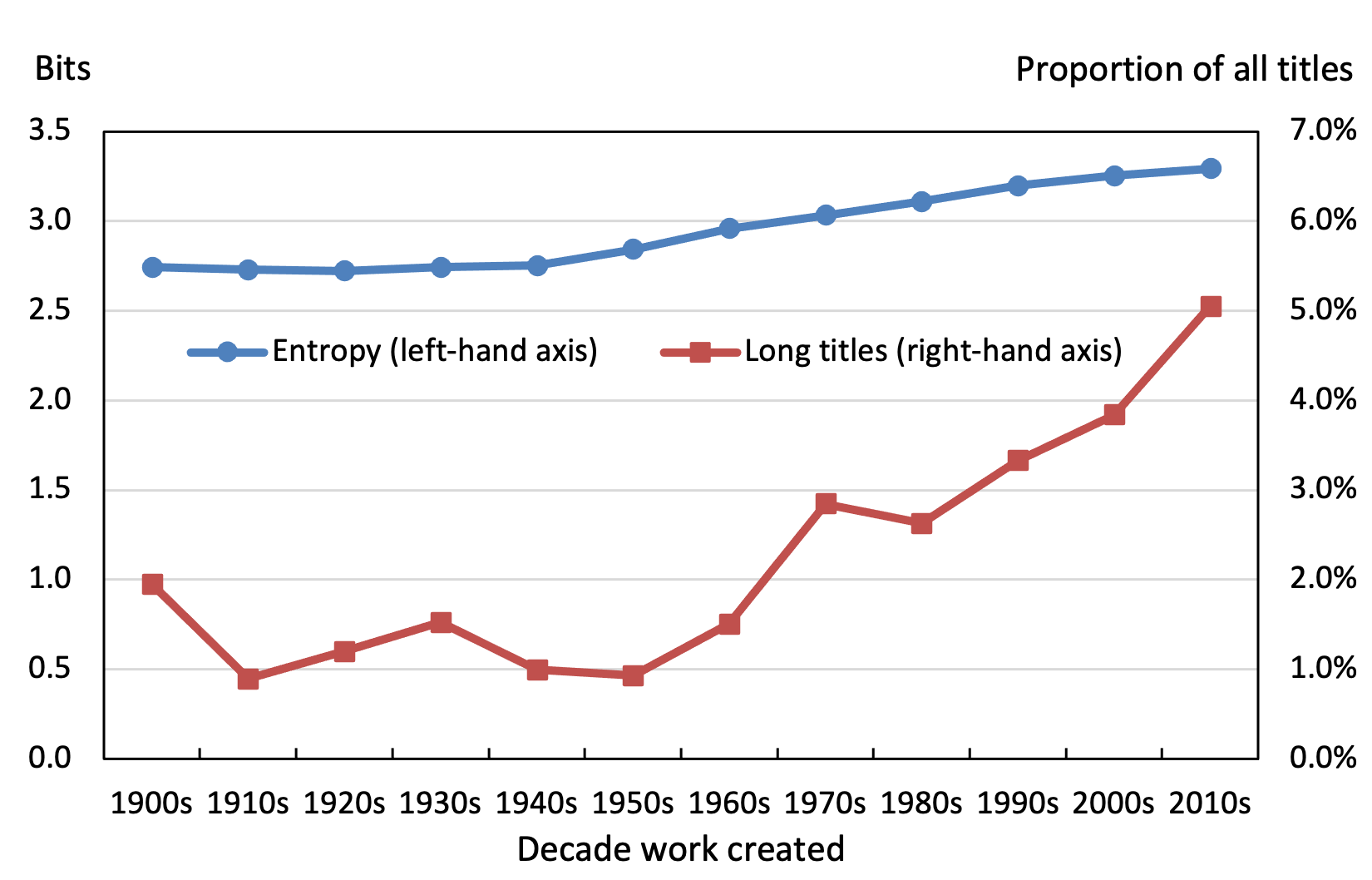 Whilst minimal titling has declined in recent decades, the use of long titles and the syntactic complexity of titles have both been growing. After having declined in the first half of the twentieth century, use of long titles of ten words or more then picked up, growing from 1.0% of all titles of works created in the 1950s to 5.0% in the 2010s, as shown in Figure 11. The parts of speech model shows that in recent decades there has been more variety in the parts of speech used in titles, including increased use of all kinds of punctuation mark. A succinct measure of the syntactic complexity of titles in this sense is the entropy of the parts of speech distribution, and, as can be seen from Figure 11, this has been rising steadily from the 1940s. Long or syntactically complex titles can be used to do many things. One is that they would have stood out from the often-minimal titles around them and so functioned ‘seductively’, attracting the attention of the reader.