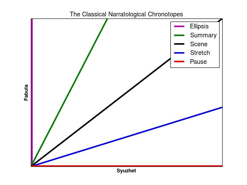 Based on the angle it makes with the horizontal (Figure 1), an NC can be categorized as one of the five canonical “movements” of classical narratology: pause, stretch, scene, summary, and ellipsis.13 Following Fludernik’s notation schema (7), I classify an NC by comparing the duration of its fabula (F) to its accompanying length of syuzhet (S).