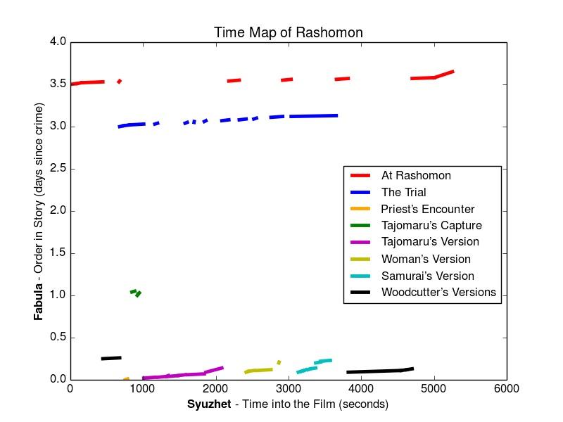 Rashomon’s time map (Figure 2) demonstrates two distinct geometries of parallel storytelling. The first form results from recursively nested storylines unfolding simultaneously across the syuzhet. Aside from Tajomaru’s capture (green) and the priest’s recollection of encountering the samurai and the woman before they are attacked (orange), the film’s NCs cluster into three groups which resemble vertically displaced line segments: red corresponds to the outermost frame narrative, which features a monk, a woodcutter, and a peasant waiting out a rainstorm; blue corresponds to the trial, as recollected by the monk and woodcutter; and the remaining colors sync up with mutually exclusive accounts of the events which prompted the trial.23 Genette describes the second form of parallel storytelling in Rashomon as repetition, referring to the repeated narrations of the same encounter (Genette, Narrative Discourse 54).24 Because Rashomon makes heavy use of both types of parallel storytelling, the film’s time map quintessentially exemplifies a more general theoretical pattern: that stories with multiple timelines will be vertically offset from one another,25 while those with repeated events will contain line segments which are horizontally offset. Time maps, in short, enact geometric materializations which intuitively approximate abstract notions of “parallel storytelling.”26