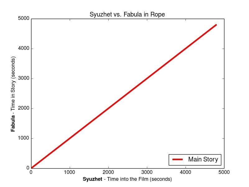 Figure 4 zooms into Mrs. Dalloway’s main storyline. This graph features the instances when Big Ben tolls, along with several other well established TOs — moments when the mechanical aspect of time is readily identifiable.29 Notably, my linear method of representation reduces to Genette’s punctual method in this limiting case. My numerical approach does not incorporate Woolf’s fluid focalization shifts, though it does demonstrate how the day’s events approximate a pattern of “rigorous linearity” (Currie 36). Attempting to connect the dots reveals that there is a sudden jump from about 07:00 to 11:00 (25), an ellipsis between the morning’s events (red) and an elongated presentation of characters’ lunchtime happenings (blue). This meal lasts an hour in the fabula, yet it spans a third of the syuzhet. There is another bend at 12:00, and the remainder of the NCs (green) are nearly collinear with its first few, reflecting a shift in the pacing of character development. The graph for Mrs. Dalloway’s main storyline is very nearly linear, but not quite.30 This contrasts with the perfectly linear time map of the main storyline of Alfred Hitchcock’s Rope (Figure 5). Comparing these graphs demonstrates a key difference between the camera and the written word: real-time filming means that perfectly linear NCs are unremarkable in cinema, but the slippery nature of language makes them rare in writing. This tension between experiential and mechanical time is what makes Mrs. Dalloway so memorable.