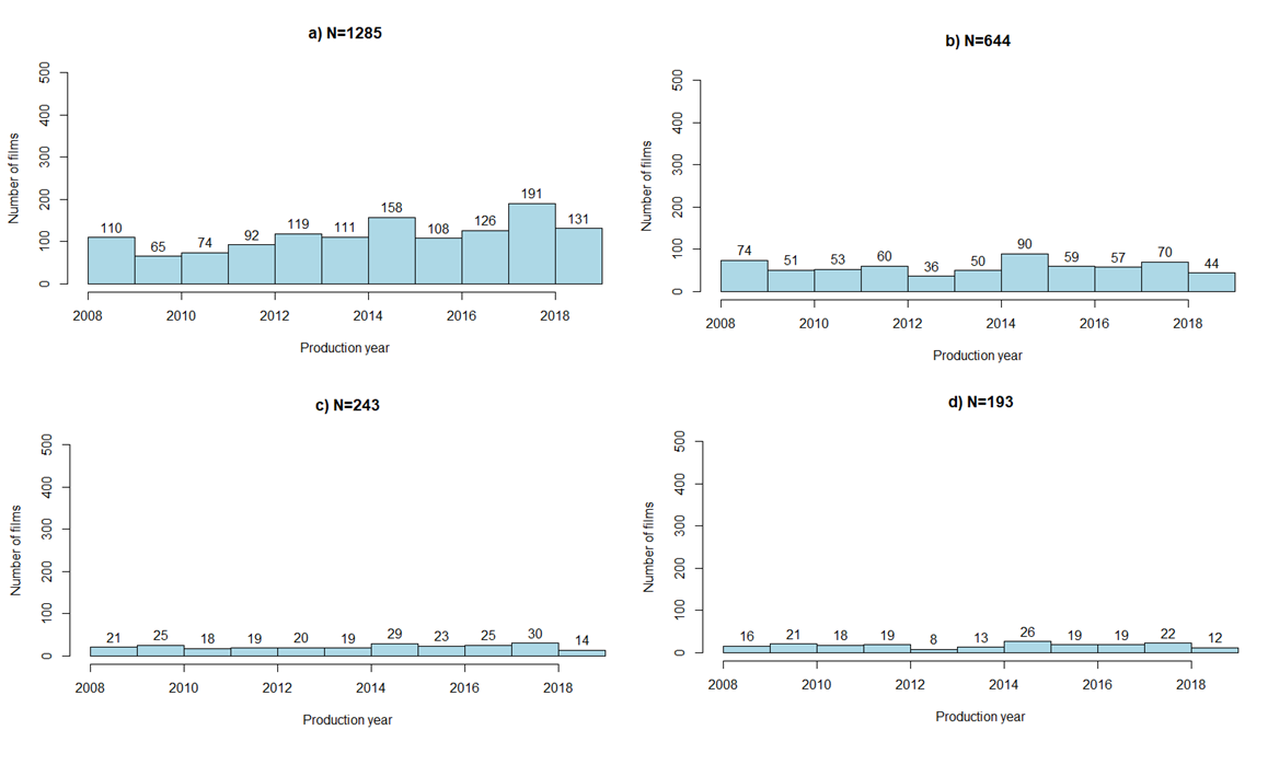 We use a dataset (N=1285) that includes all Russian films produced between 2008 and 2019 and theatrically released between December 1, 2008, and December 31, 2019 (referred to as the full dataset). Distribution statistics cover the territory of the CIS of which the Russian Federation is the biggest market. Budget information is available for 644 films, and BWL test mark-up – for 243 films (further referred to as the marked-up dataset). Both of the latter subsamples are relatively evenly distributed through period the 12 years of our analysis (Fig. 2). The datasets alongside the detailed description of all variables are available in the supplement to the article at https://doi.org/10.7910/DVN/GDKOSR.
