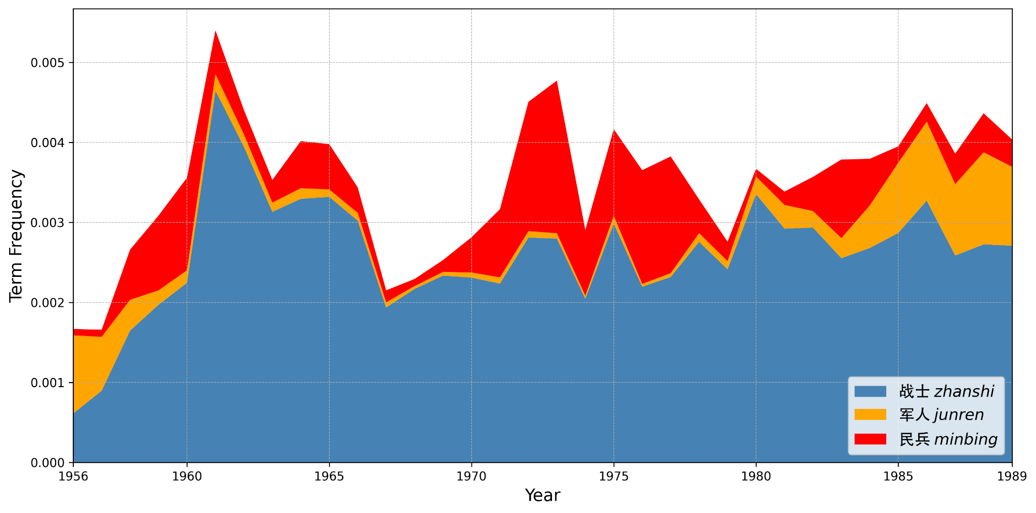 In this article, we use quantification as an exploratory and conceptual tool; not to arrive at a final conclusion as to which day and which hour in modern China’s history was most violent, but rather to suggest a distributional way of thinking about state violence and its legitimation. Quantitative approaches to texts such as the PLA Daily offer unique perspectives on the distribution of violence as a way of legitimizing distinct forms, agents, and targets of state power. We show how the three different soldier vectors: junren, zhanshi, and minbing acquired political legitimacy to engage in violence on behalf of the People: whereas the junren in the 1950s conveyed a focus on professional violence, it was relegated to a secondary role by the romanticized zhanshi during the Cultural Revolution, only to regain prominence after Mao Zedong’s death and the rise of new nationalism in China. Minbing, on the other hand, vacillated precariously between the two in an uneasy relationship with the regular armed forces. In addition to tracing such changes genealogically, we also show that violence in the PLA Daily has been distributed hierarchically: the “people vs. the People” narrative concentrated military sentiment throughout the analyzed period, whereas international topics manifested only intermittently. The selective reportage in the PLA Daily during the Cultural Revolution was not merely a reflection of global events but a distributional maneuver to shape domestic perceptions. Further big data research is necessary to examine similar narrative strategies in other sources.