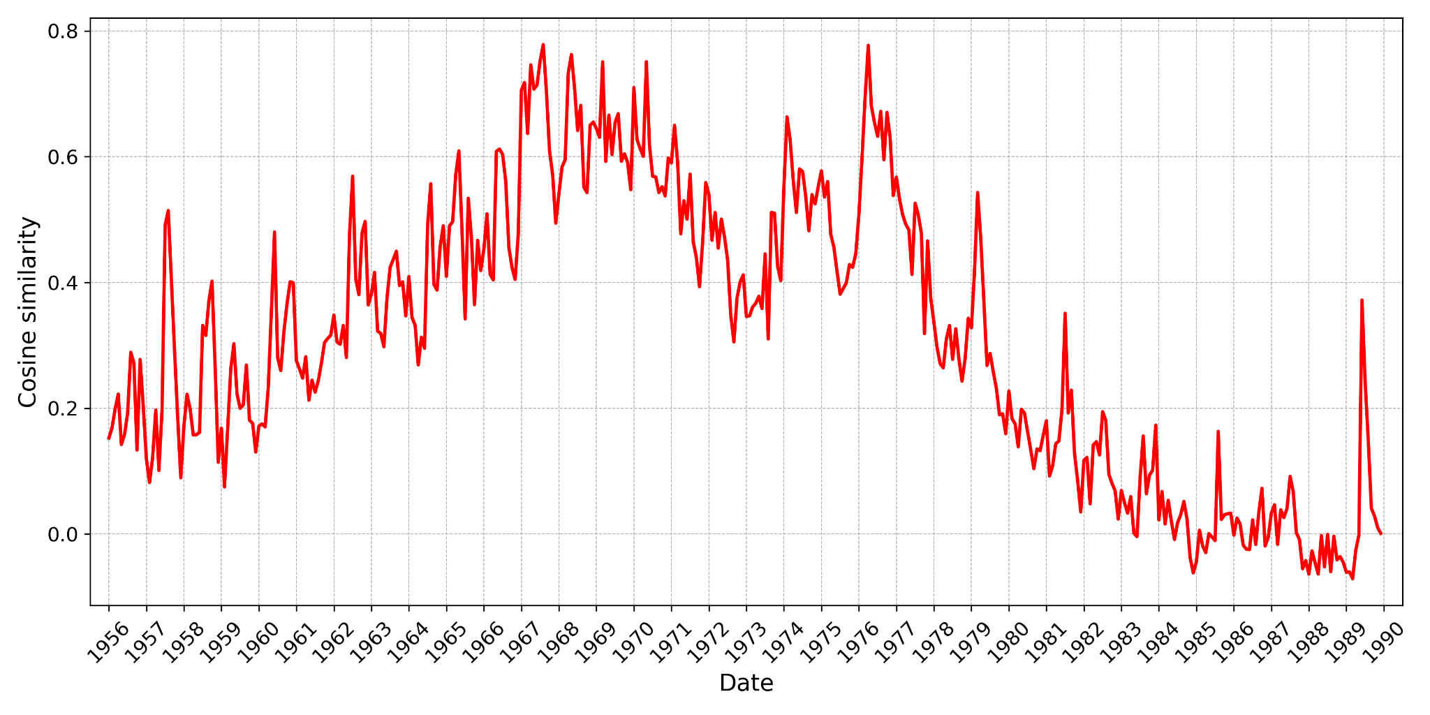We randomly selected 100 violent articles from each year and transformed them into vector representations (embeddings) with the help of a large encoder model. These representations were then averaged into “vectors of violence” through k-means clustering.16 In the next step, we computed cosine similarities between the vectors of violence and the individual embeddings of all articles published between 1956 and 1989.17