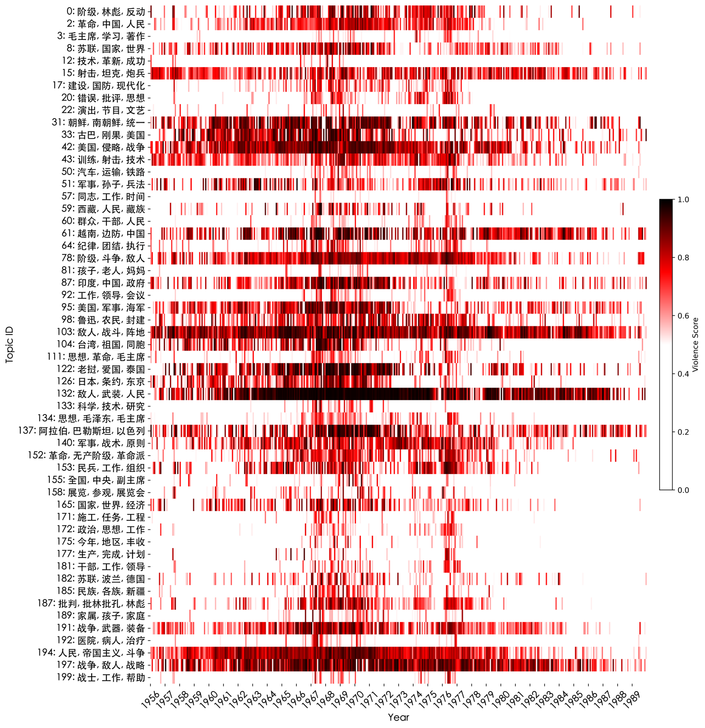 Thus, while propagating an anti-colonial ethos and championing global justice, the official narratives published in the PLA Daily simultaneously served an important rhetorical purpose at odds with the happenings inside the country. A computational analysis which allows for the observation of shifts in the topical distribution of violence over time makes such narrative strategies more easily identifiable when combined with traditional historiographical approaches.