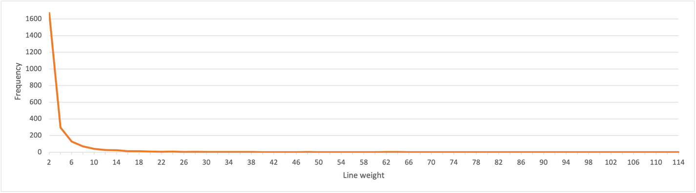 So far it has been difficult to view the network’s structural core, defined by its strongest collaborations, as that core is hidden amidst so many low-degree nodes and low-weight links, representing weak collaborations. In order to view the core structure we need to peel away weak collaborations in order to see the stronger ones more clearly, via a threshold for significant collaboration. Such a threshold is bound to be somewhat arbitrary (one of SNA’s methodological problems is determining such cutoffs), but if we compute the 95th percentile of link weights (see Figure 4), we find that a minimum weight of 7 (i.e. collaborations on seven songs or more) represents the top 5% of all collaborations. Therefore, as a starting point we will define 7 songs as the threshold for “significant collaboration”. We can then extract what is sometimes known as the “7-slice”, comprising the subnetwork comprising lines of weight 7 or higher only. All weaker lines are deleted, along with any nodes that are thereby disconnected (i.e. which do not collaborate with anyone on at least seven songs). We can then re-energize this subnetwork in order to visualize its structure.