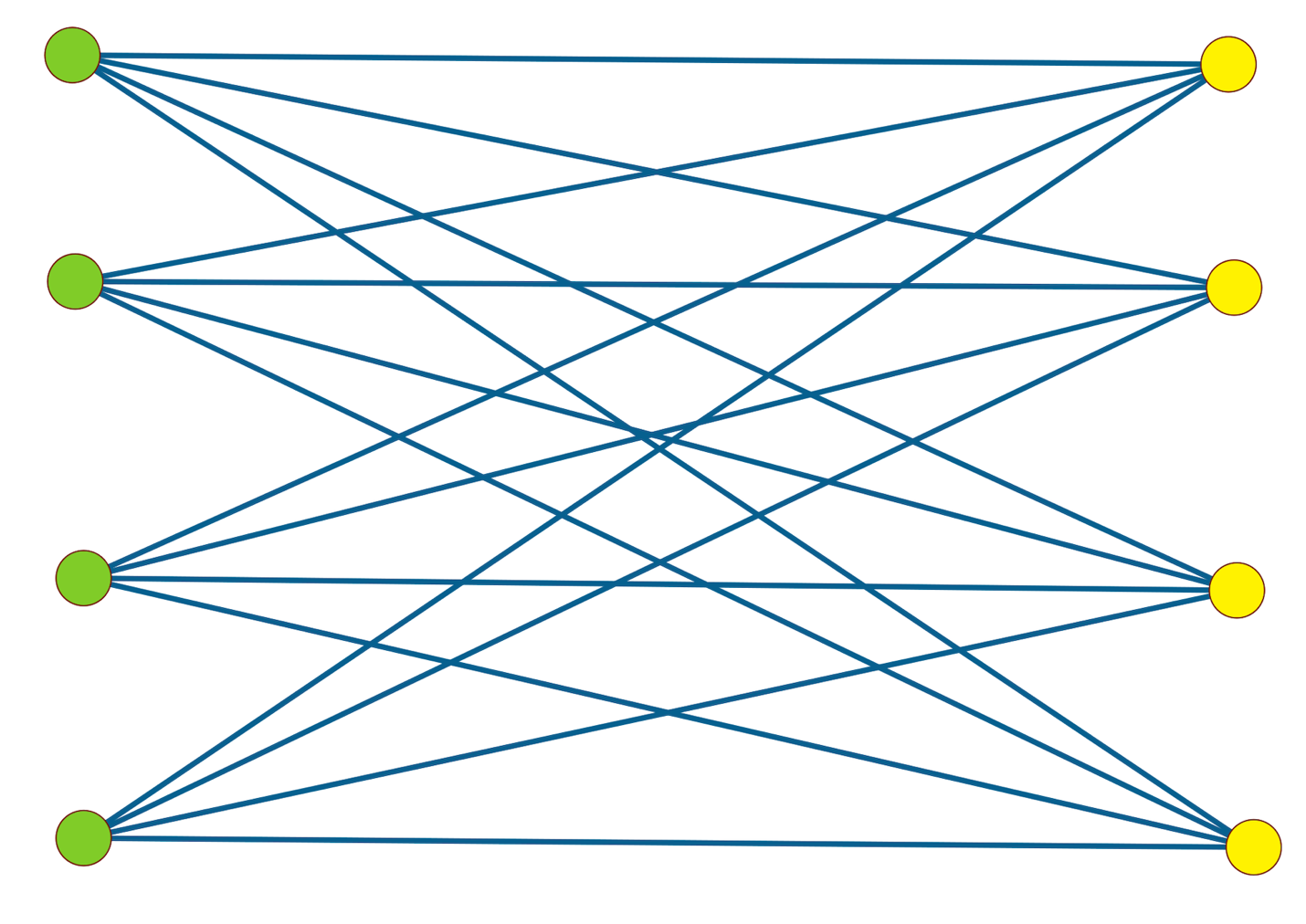 Another way to locate cohesive subgroups is to search for bipartite cliques. A clique is a fully connected subset of nodes. Thus a dyad is a clique of two, and a closed triad is a clique of three. A clique of four is a square with diagonals added. For two-mode (bipartite) networks, where links cannot connect within but only between modes, no cliques exist beyond the dyad. Therefore, a bipartite clique is defined as a subset in which every node in the first mode is connected to every node in the second; this subset is maximally connected within the bipartite network. For instance, Figure 8 represents a bipartite clique: four composers and four poets, with every possible poet-composer pair connected.