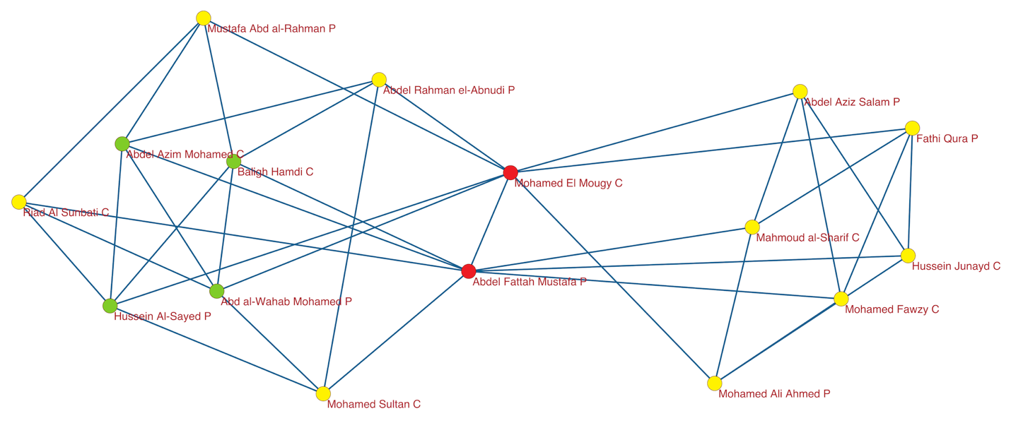 We can search for instances of such a structure throughout the larger network, counting the number of Figure 8-type cliques in which each network node is a member, in order to highlight cohesive subgroups. Searching detects three instances; the result is shown in Figure 9, where red nodes are members of all three cliques, green nodes are members of two, and yellow nodes are members of just one (nodes that are not members of any bipartite clique are removed). Energizing (using Kamada Kawai), the red nodes move to the center, and yellow nodes to the periphery. The analysis highlights the centrality of poet Abdel Fattah Mustafa and composer Mohamed El Mougy, who together link the two halves of this tightly connected web