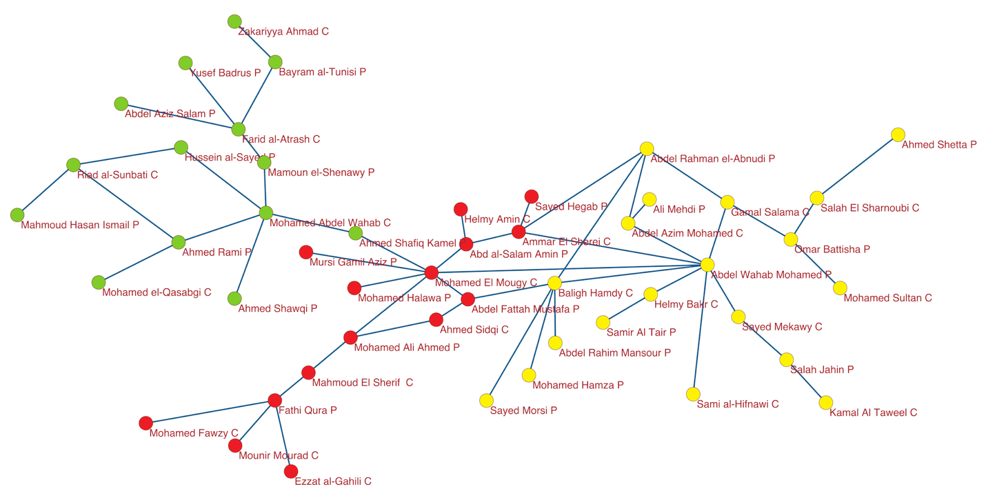 Several recent scholarly studies in English likewise focus upon a single celebrated performer or composer (Danielson; Zuhur; Frishkopf, “Nationalism, Nationalization, and the Egyptian Music Industry”), though contextualized within cultural history. Other English-language studies present broader social histories of music, transcending a focus on the individual, yet remaining largely in the camp of small data, qualitative interpretation, centered upon prominent individuals, though Salwa El-Shawan’s scholarly oeuvre presents some quantitative analyses as well (Racy, “Sound and Society: The Takht Music of Early-Twentieth Century Cairo”; Racy, “Music in Nineteenth-Century Egypt: An Historical Sketch”; El-Shawan, “Western Music and Its Practitioners in Egypt (ca. 1825-1985): The Integration of a New Musical Tradition in a Changing Environment”; El-Shawan, “The Socio-Political Context of al-Musika al-ʿarabiyyah in Cairo, Egypt: Policies, Patronage, Institutions, and Musical Change (1927-77)”). Again, Brinner’s exemplary study of Israeli and Arab musicians applies social network theory, but in a qualitative, small data manner. Without a doubt, all these works contribute importantly to Arab music history, and yet small data limitations mean that they also miss emergent patterns that can only be discerned through a big data social network analysis approach.