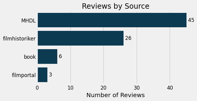We thus dedicated ourselves to a manual collection of reviews, eventually establishing a corpus of 80 reviews distributed as follows: 38 (47%) reviews for Caligari, 25 (31%) for Metropolis, and 17 (21%) for Nosferatu (Figure 1). While the majority of these (56%) were still obtained through the MHDL, other sources also proved important (Figure 2). A little-known website by the independent scholar Olaf Brill called filmhistoriker.de proved particularly helpful (contributing 32% of reviews) due to its provision of clean digital text of German-language Weimar-era film reviews split by movie. The third largest source of reviews were books, which reprinted historical reviews in full (Minden and Bachmann; Kaes et al.). Furthermore, our quest to broaden our collection of non-English language reviews led us to explore alternative sources, such as from our fourth online resource, filmportal.de (4%), maintained by the Deutsches Filminstitut & Filmmuseum (DFF). Unfortunately, filmportal holds very few reviews per film, and often only as an image with no OCR at all. While we applied OCR ourselves to those materials using the open-source software Tesseract, this was often futile when it came to poorly scanned and maintained sources, particularly those written in the German gothic script known as Fraktur.