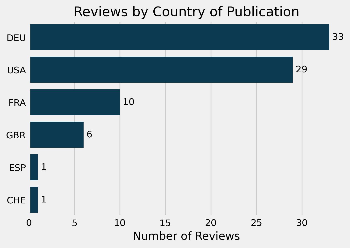 Four languages are represented in our corpus: approximately the same number of reviews were written in English (34) and German (32), but there are also some in French (10) and Spanish (4) (Figure 3). Regarding the country of publication, a large number of reviews were published in Germany (33), followed by the USA (29), France (10), Spain (1) and Switzerland (1) (Figure 4). It is important to note that publication locations are not neatly aligned with languages. For instance, the magazine Cine-Mundial, which has four reviews in the dataset, presents a complex case of a Spanish-language publication targeted at the Spanish and Latin American market, but published in the USA. To ensure linguistic consistency for further processing, we translated all non-English language reviews to English. This was done with a combination of DeepL and manual checking of the results, as we are proficient in these four languages. While it would have been possible to use different models for different languages, we felt that building a uniform corpus would be preferable to ensure consistency and comparability of the reviews. The comparison of sentiment analysis results between translated and non-translated reviews indicated that translation did not alter the outcome.