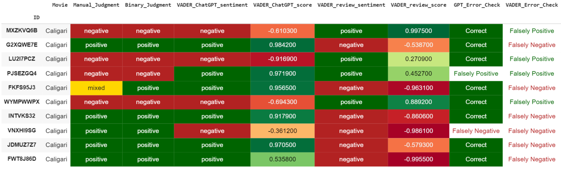 There were 10 instances (26%) where VADER deviated from our manual analyses of Caligari. As we shall see, this was the best result out of the three films. The ChatGPT-VADER model only made two mistakes, and in both cases VADER-only had made the same mistake. In the case of Caligari reviews, the direction of mistakes is fairly even – there were four false positives and 6 false negatives in the VADER-only model, and one of each for the two mistakes of the hybrid model (Figure 7). We will proceed to examine these two exceptional cases more closely.