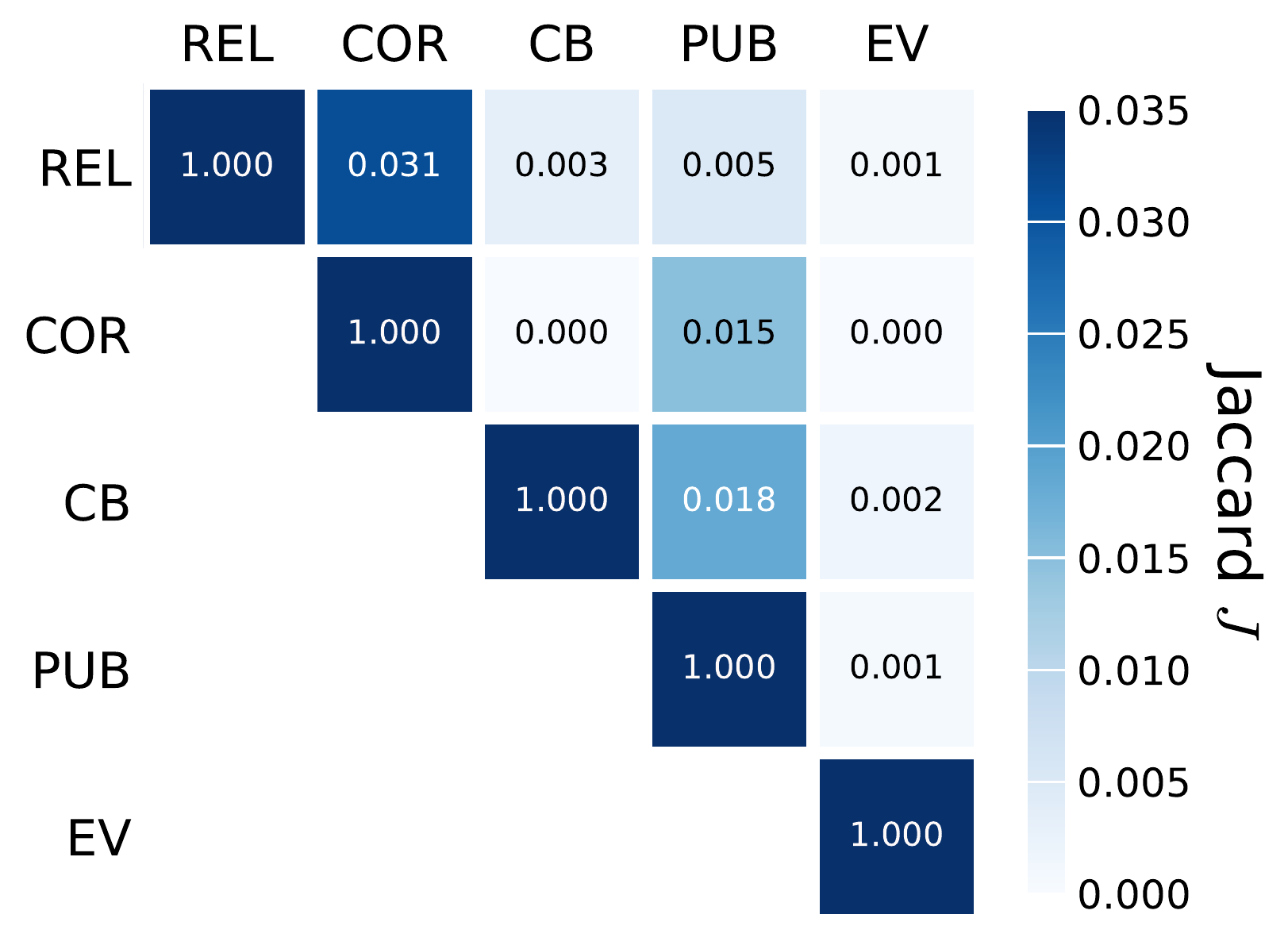 To quantify the overlap of information in each layer pair, we use Eq. (1) to compute the pairwise Jaccard index J(α,β) between layers 𝛼 and β. Figure 2 shows the heatmap matrix of the values of J computed for all the pairs of layers. Except for the elements of the main diagonal (comparing a layer with itself, thus translating to a value of J=1) all the remaining values of J are quite small. This means that the amount of redundant (i.e., overlapping) information encoded in our layer networks is quite small, ranging between 0.0 and 0.031. In other words, our layer networks are quite distinct from one another. Such differences justify the use of multiplex network formalism (Bianconi).