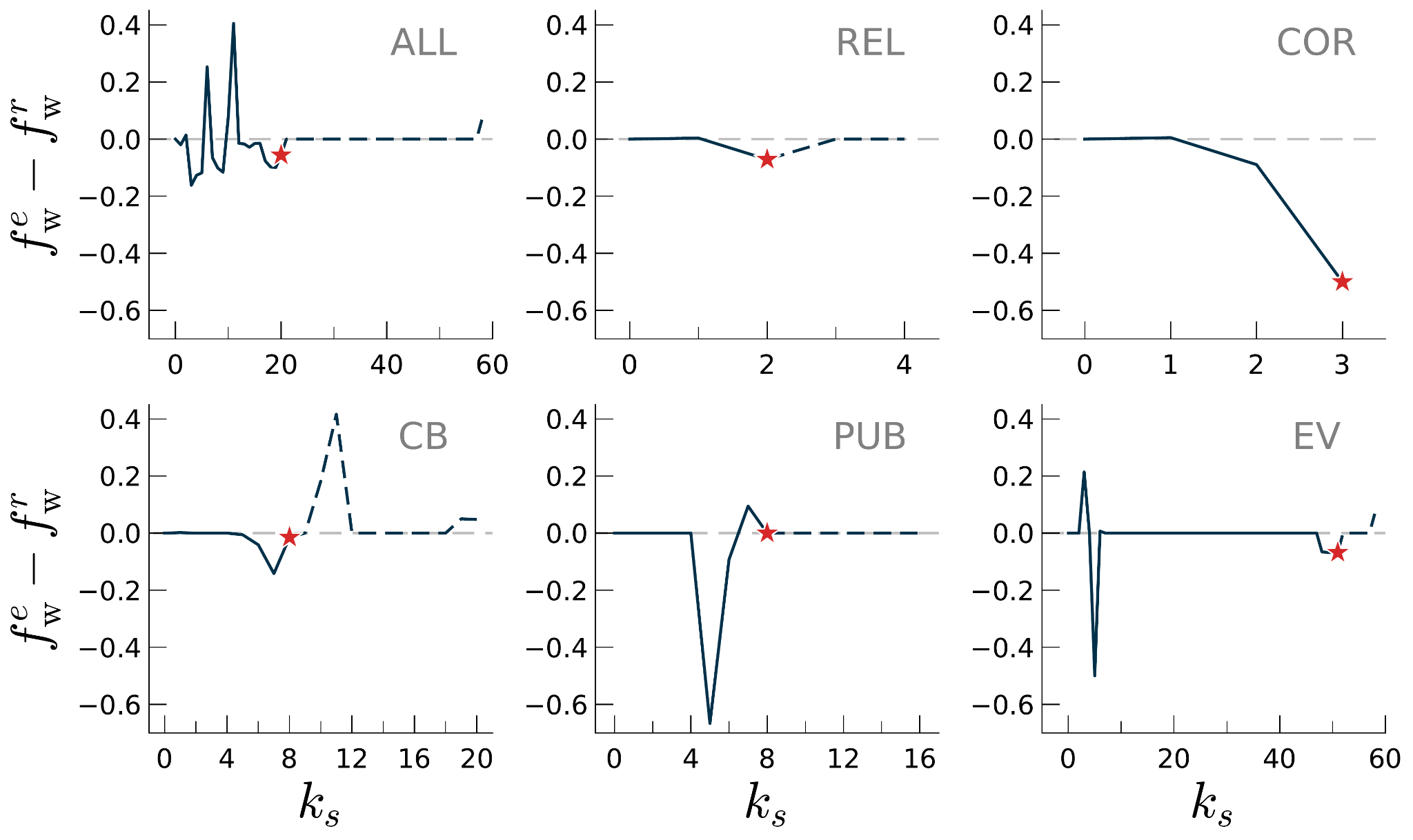 Each panel accounts for a distinct network, whether the whole network (ALL) or a single layer (REL, COR, CB, PUB, and EV). The red star indicates the deepest k-shell (i.e., the network’s degeneracy (D)) obtained in the random network counterpart Dr, whereas the dashed line denotes the k-shells for which only the empirical value, fWe, exists. Random values are obtained by averaging the results over 50 realisations.